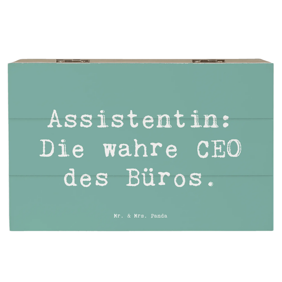 Entdecke die bezaubernde Holzkiste mit dem Slogan "Assistentin: Die wahre CEO des Büros" von Mr. & Mrs. Panda! Diese wunderschöne Erinnerungskiste ist perfekt, um all deine wertvollen Schätze aufzubewahren.