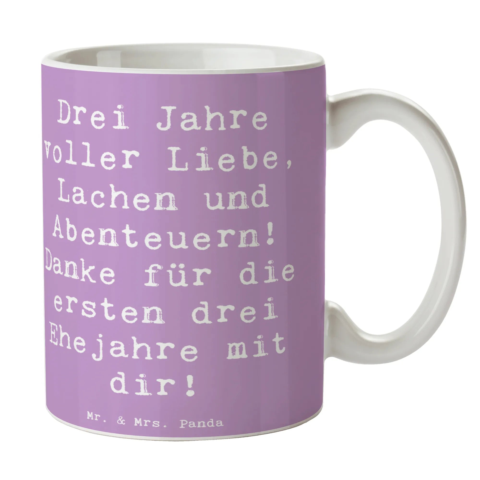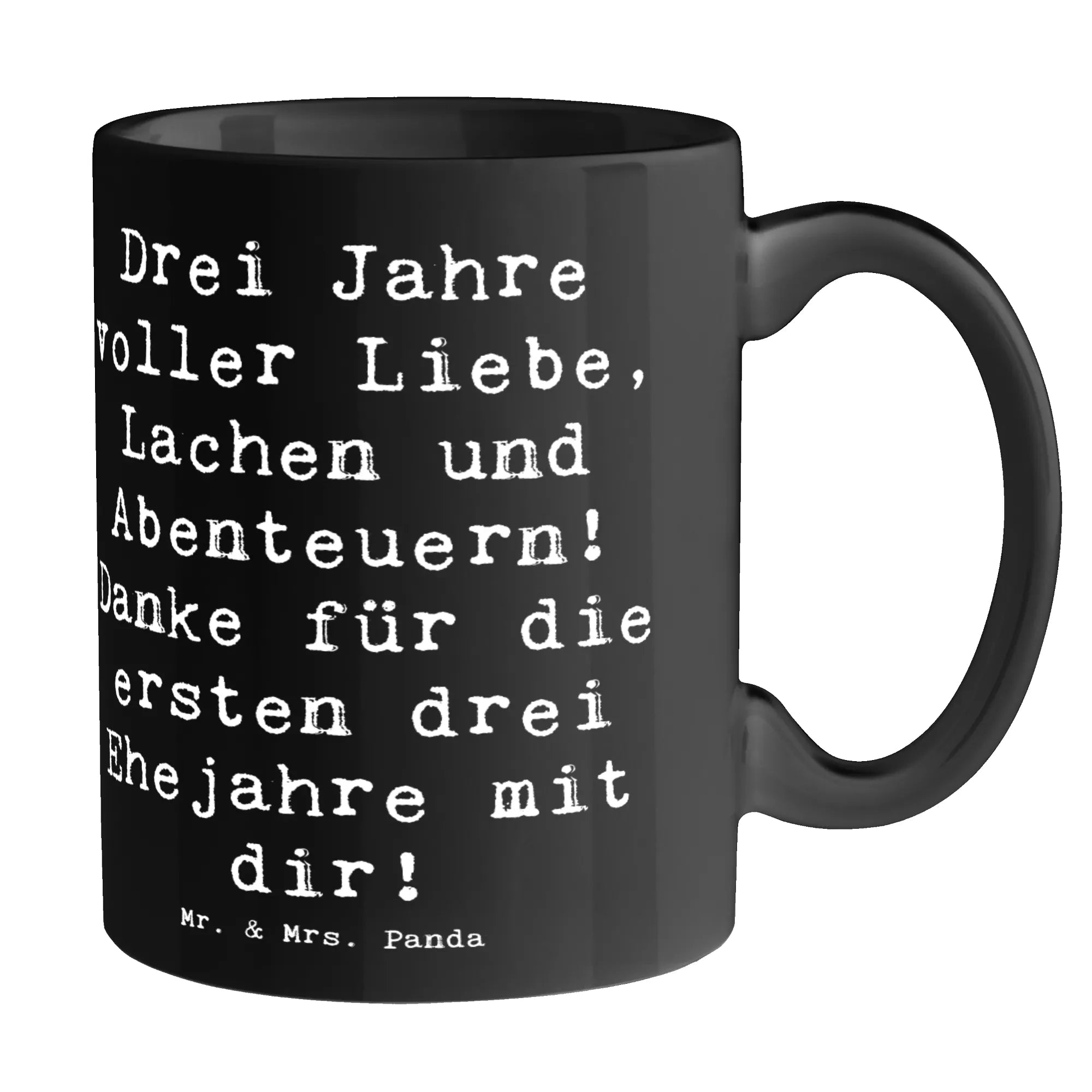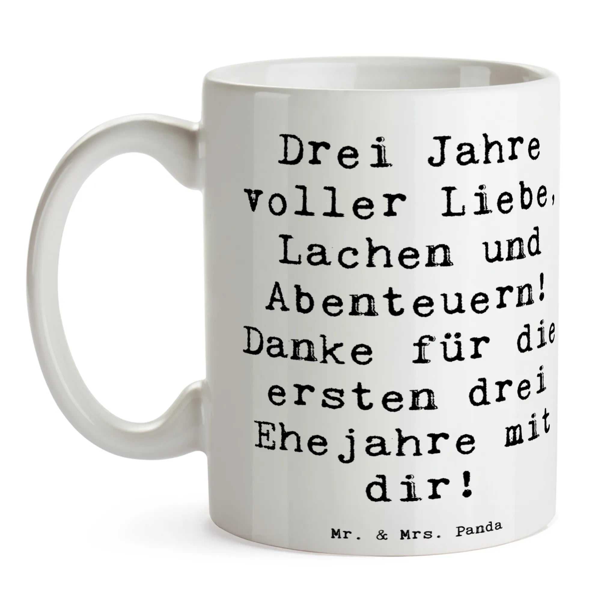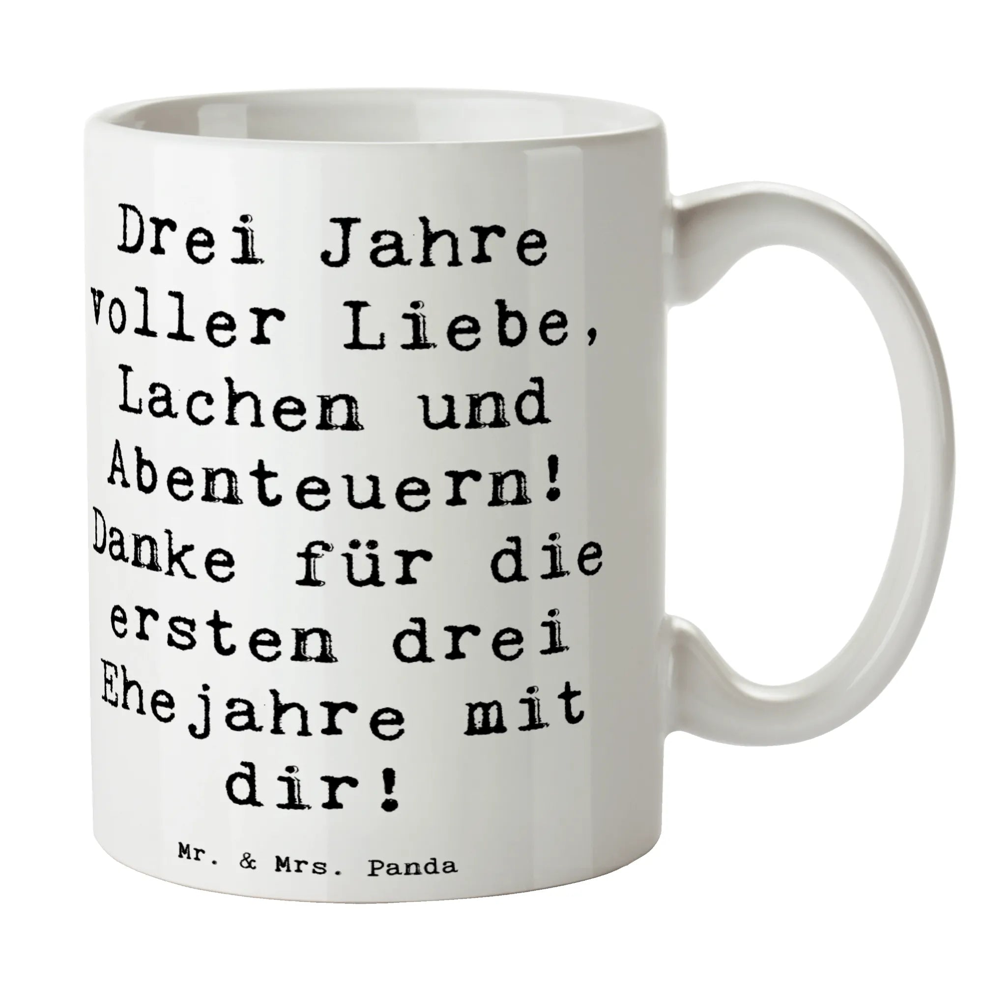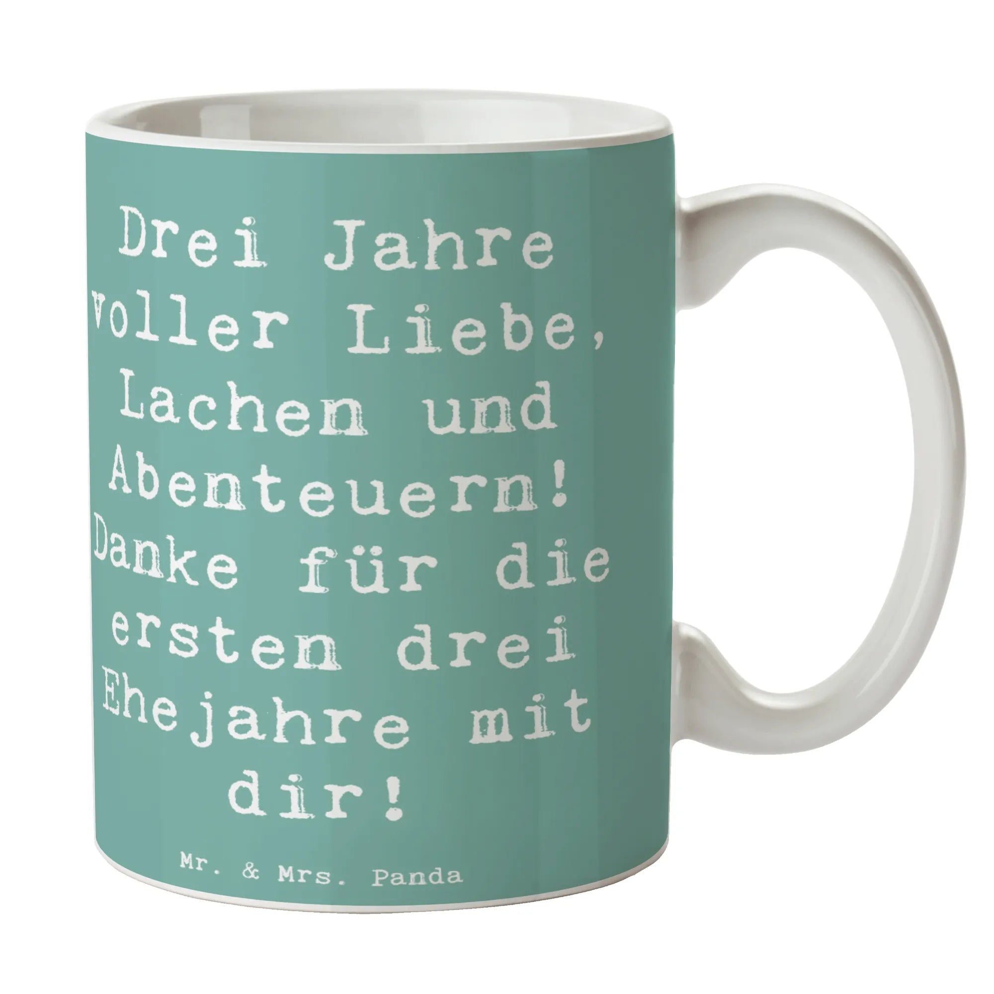 Du suchst das perfekte Geschenk zum dritten Hochzeitstag? Unsere wunderschöne Keramiktasse "3. Hochzeitstag Lederhochzeit" von Mr. & Mrs. Panda ist genau das Richtige! Mit einem liebevollen Slogan "Drei Jahre voller Liebe, Lachen und Abenteuern! Danke für die ersten drei Ehejahre mit dir!" bringt diese Tasse nicht nur Freude in den Alltag, sondern erinnert auch an die besonderen Momente eurer gemeinsamen Reise.