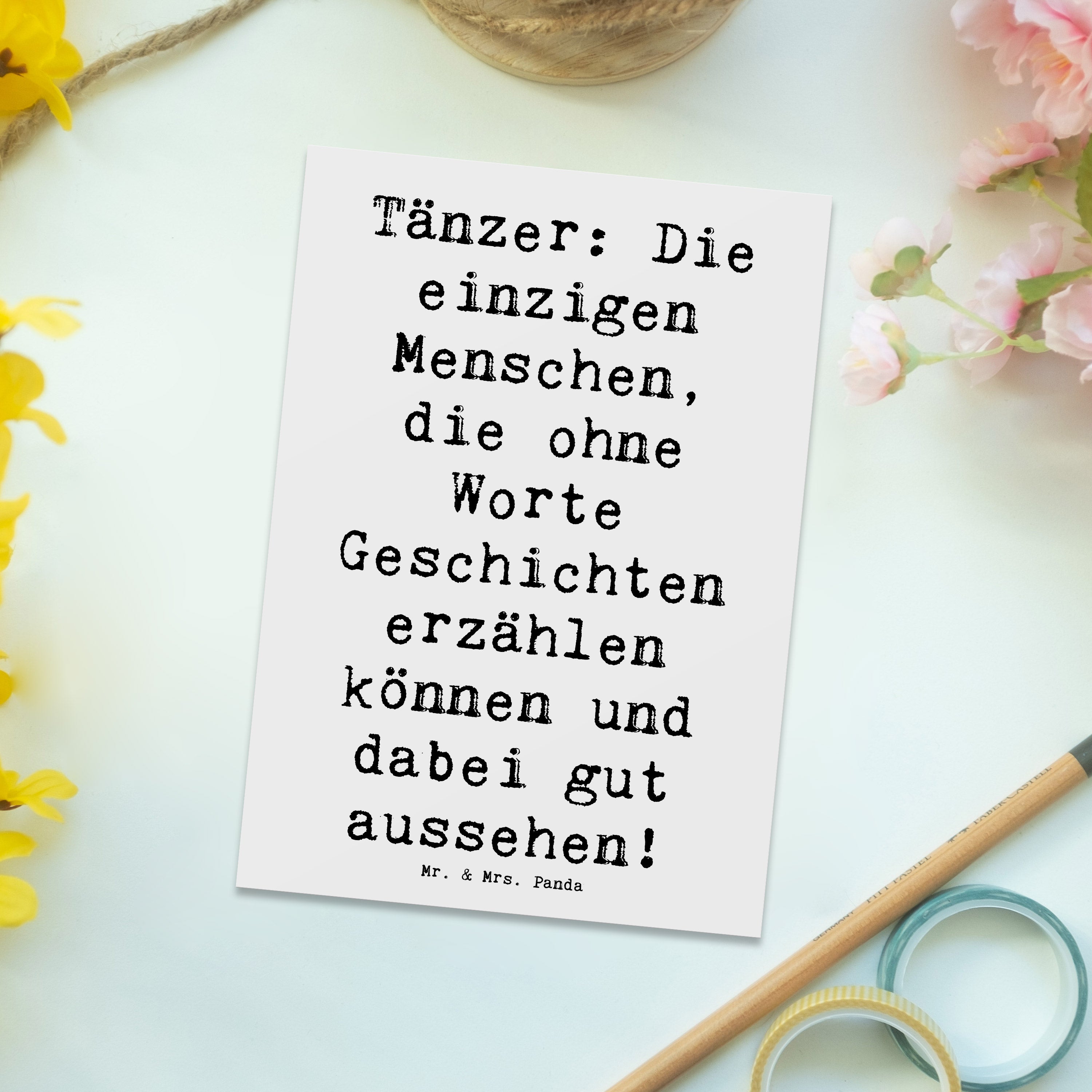 Du bist auf der Suche nach dem perfekten Geschenk für einen Tanzliebhaber? Unsere einzigartige Postkarte von Mr. & Mrs. Panda mit dem bezaubernden Motiv "Tanzen" aus der Sportarten-Kollektion ist genau das, was du brauchst! Diese Postkarte ist nicht nur eine einfache Grußkarte – sie trägt eine tiefere Botschaft: "Tänzer: Die einzigen Menschen, die ohne Worte Geschichten erzählen können und dabei gut aussehen!" Mit diesem witzigen Spruch bringst du ein Lächeln auf das Gesicht des Empfängers. Egal, ob als Geburtstagskarte, Einladung zur Tanzveranstaltung oder einfach nur als kleine Aufmerksamkeit zwischendurch – diese Postkarte ist vielseitig einsetzbar und perfekt für zahlreiche Anlässe.