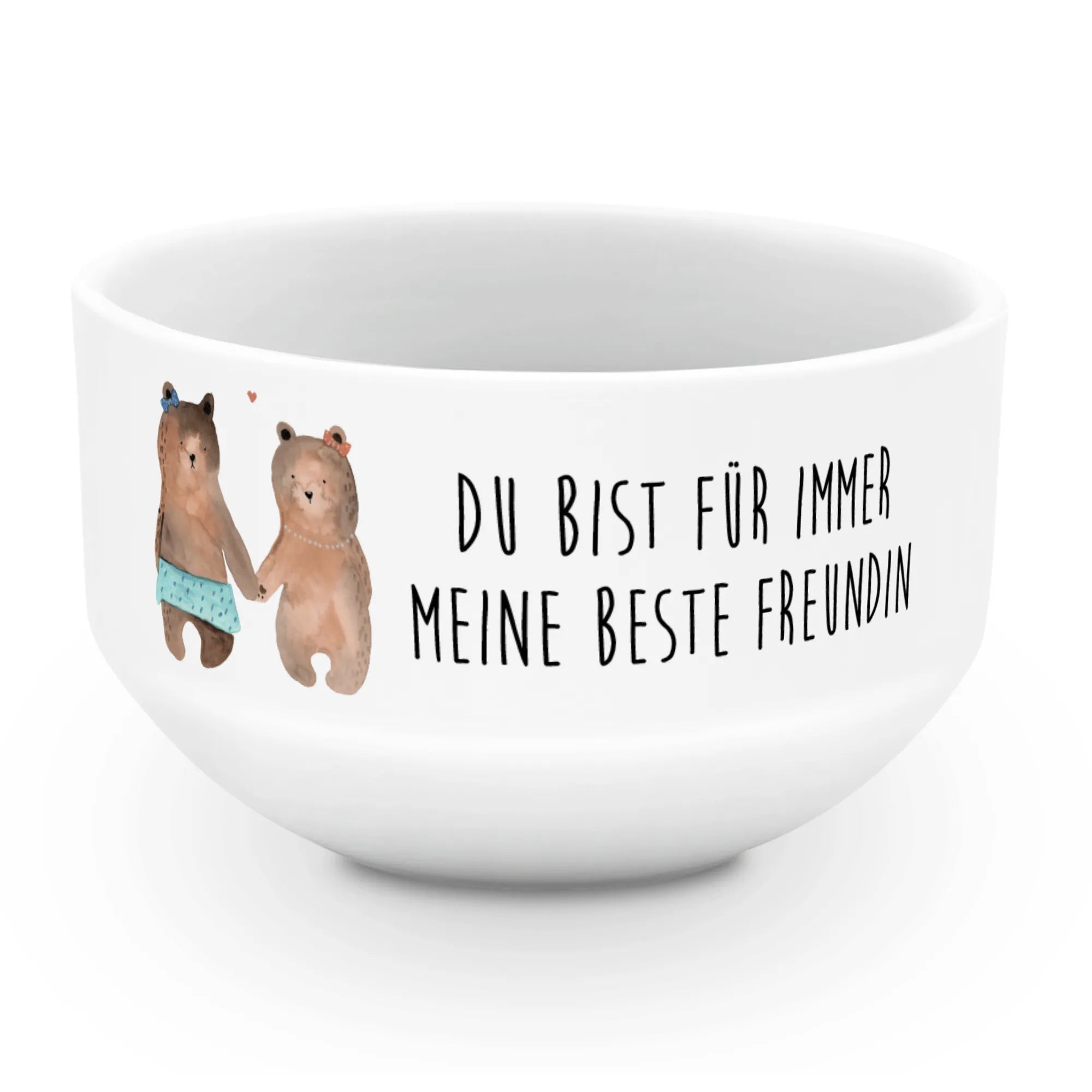 Die bezaubernde Müslischale 'Bär Freundin' aus der besonderen Bär-Kollektion von Mr. & Mrs. Panda ist der perfekte Begleiter für deinen Frühstückstisch oder als liebevolles Geschenk. Diese wunderschöne Müslischüssel mit dem liebevollen Motiv von zwei süßen Bärenmädchen, die sich an den Händen halten, bringt Freude und Wärme in jedes Zuhause. Mit dem Spruch 'Du bist für immer meine beste Freundin' zeigst du deinen Freunden, wie viel sie dir bedeuten und wie wertvoll Freundschaft ist.