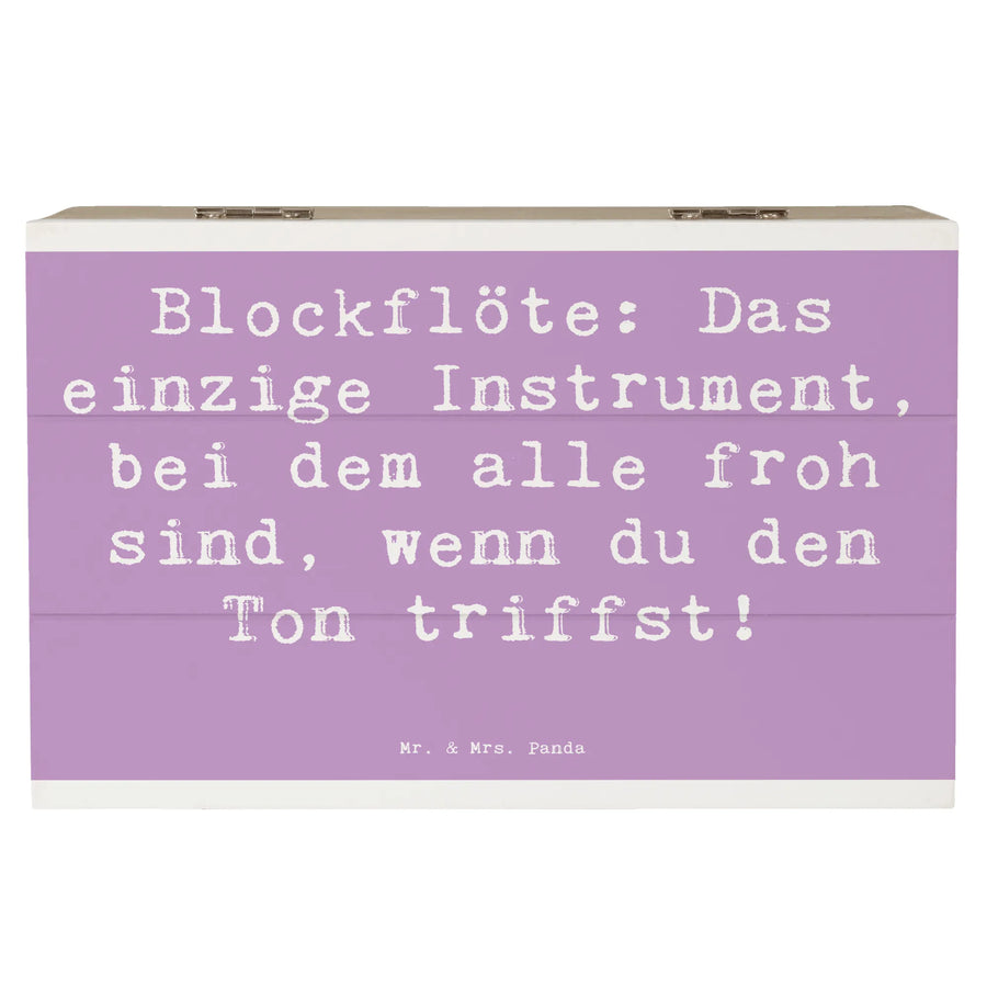 Der witzige Slogan „Blockflöte: Das einzige Instrument, bei dem alle froh sind, wenn du den Ton triffst!“ sorgt dafür, dass die Holzkiste nicht nur funktional ist, sondern auch für ein Lächeln sorgt.