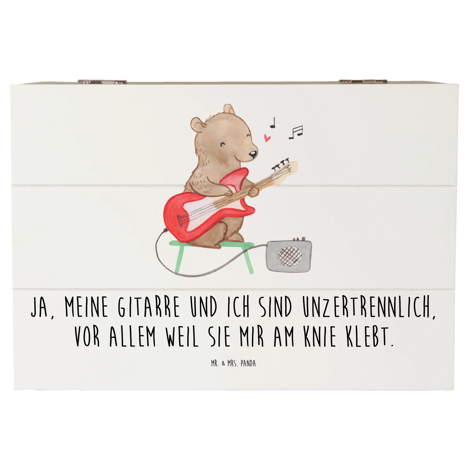 Mr. & Mrs. Panda Holzkiste „Gitarre“ – das liebevolle Geschenk für alle Musikliebhaber. Diese dekorative und praktische Kiste verbindet Humor und Herz: die Gitarre als Symbol für Leidenschaft, Kreativität und die universelle Sprache der Musik zusammen mit dem Spruch „Ja, meine Gitarre und ich sind unzertrennlich, vor allem weil sie mir am Knie klebt.“ bringt Musiker und Freunde der Musik zum Schmunzeln.