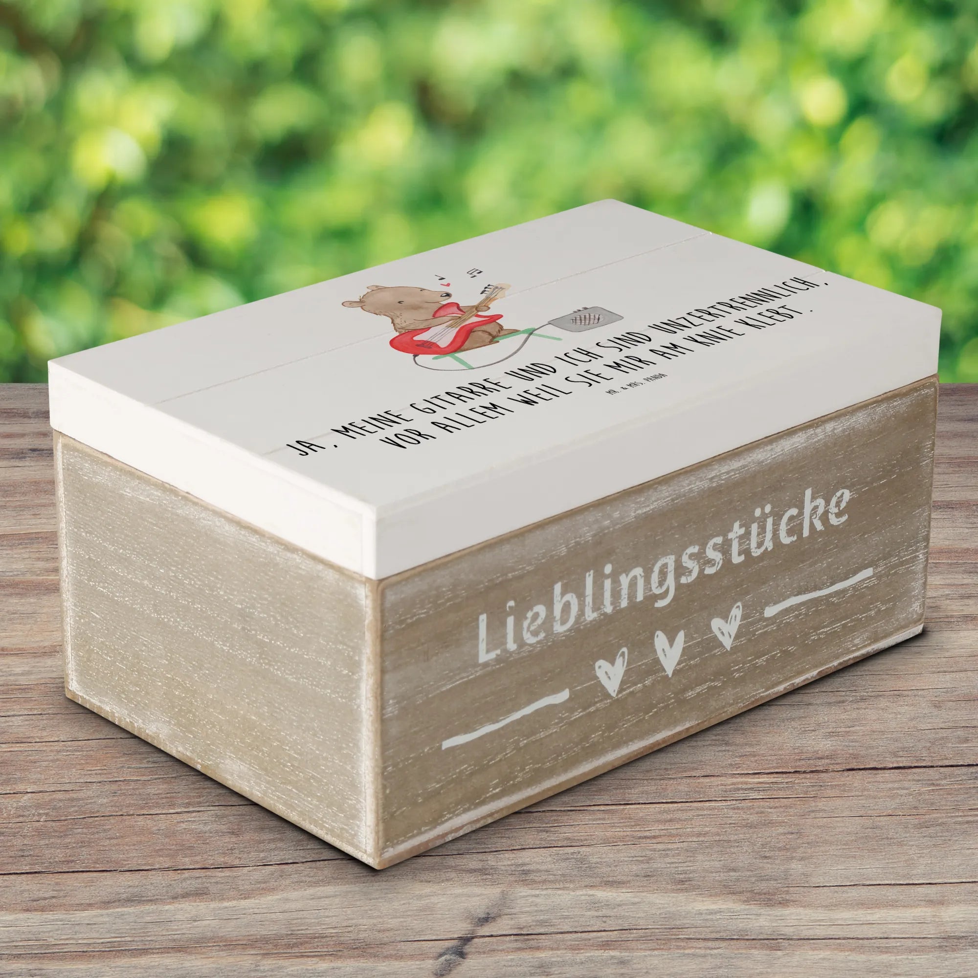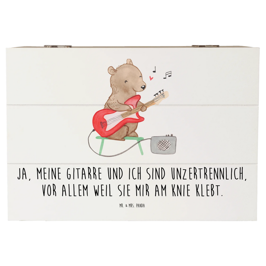 Die wunderschöne Holzkiste von Mr. & Mrs. Panda ist mehr als nur eine Aufbewahrungsbox – sie ist ein magischer Ort für all deine Schätze! Mit ihrem wunderschönen Motiv einer Gitarre und dem witzigen Spruch 'Ja, meine Gitarre und ich sind unzertrennlich, vor allem weil sie mir am Knie klebt' bringt sie Freude und einen Hauch von Musik in dein Leben.