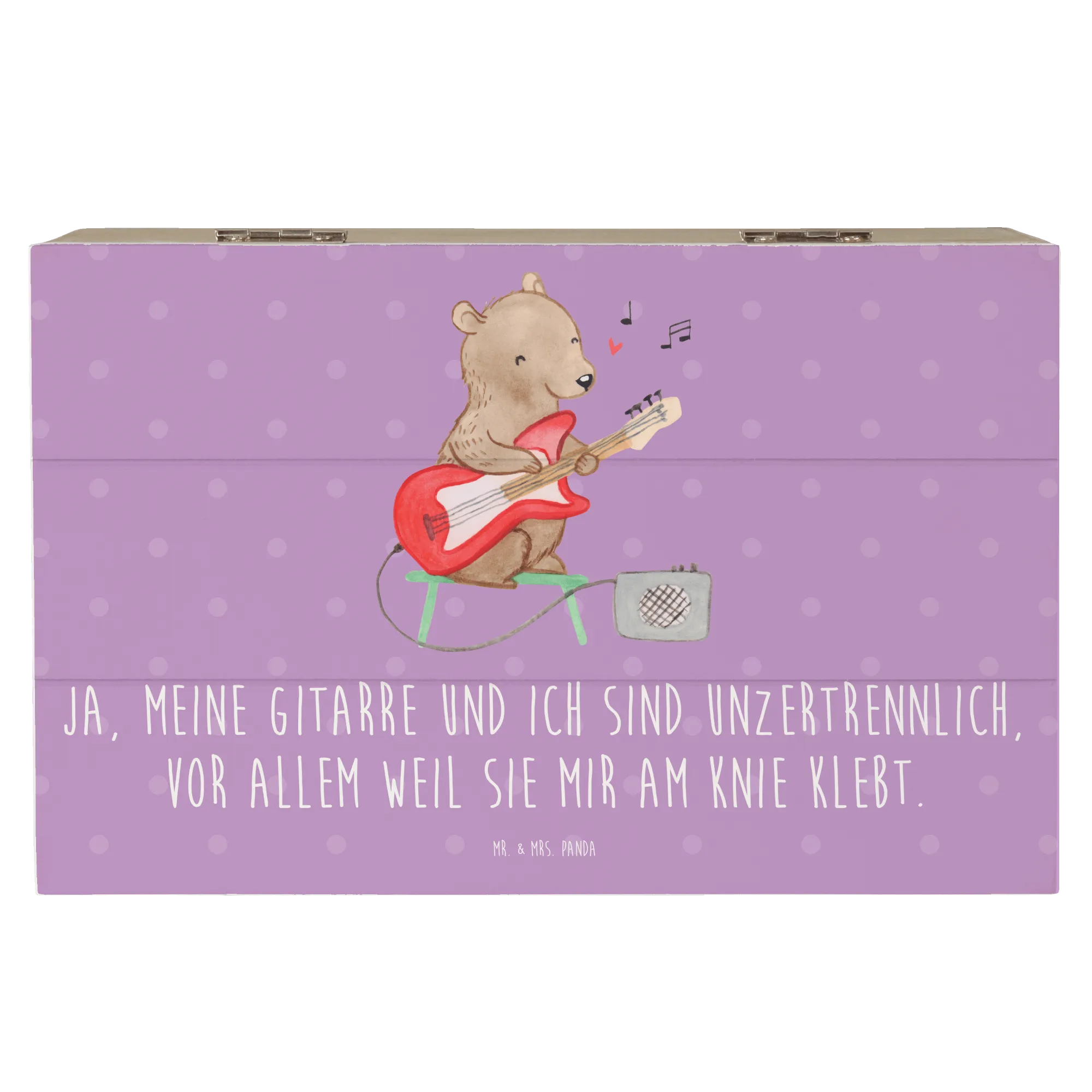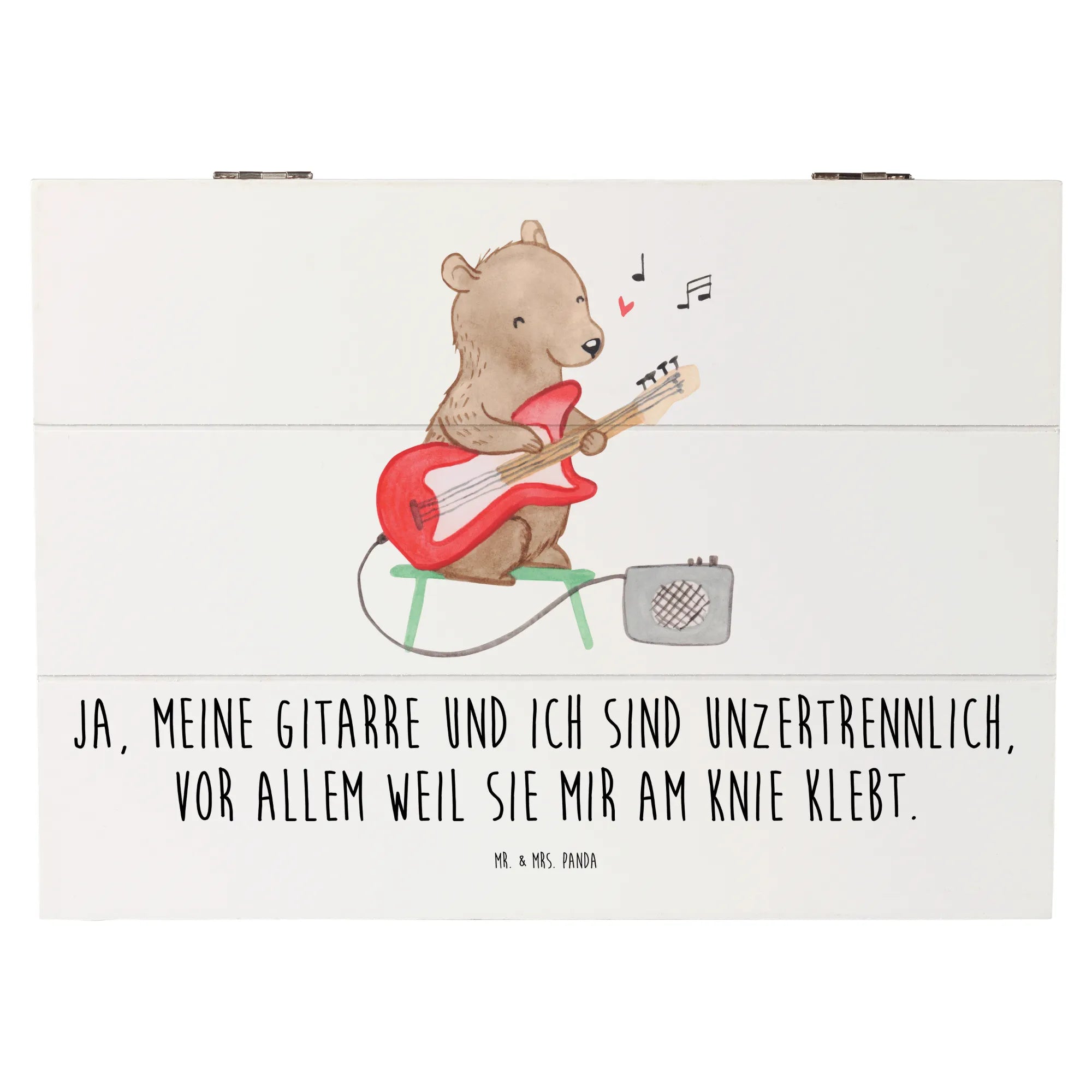 Die wunderschöne Holzkiste mit dem einzigartigen Gitarrenmotiv von Mr. & Mrs. Panda ist die perfekte Geschenkidee für alle Musikliebhaber und Musiker! 🎸 Diese Kiste ist nicht nur ein stilvolles Aufbewahrungsstück, sondern auch ein Ausdruck deiner Leidenschaft für die Musik. Mit einem inspirierenden Slogan "Ja, meine Gitarre und ich sind unzertrennlich, vor allem weil sie mir am Knie klebt." macht die Kiste jeden Moment noch besonderer.