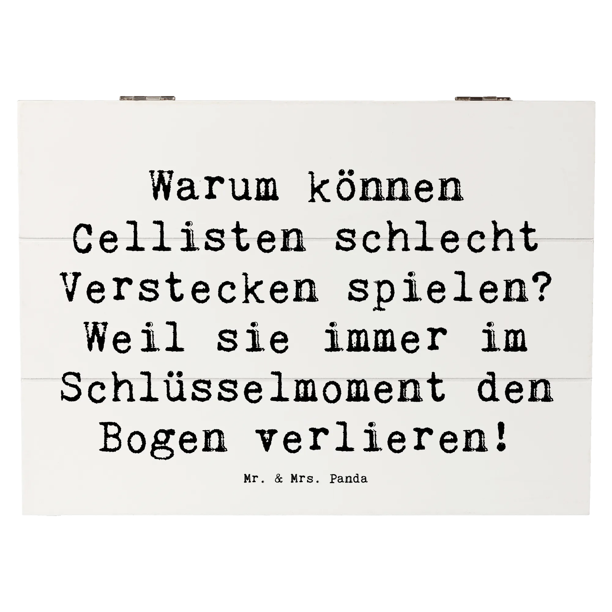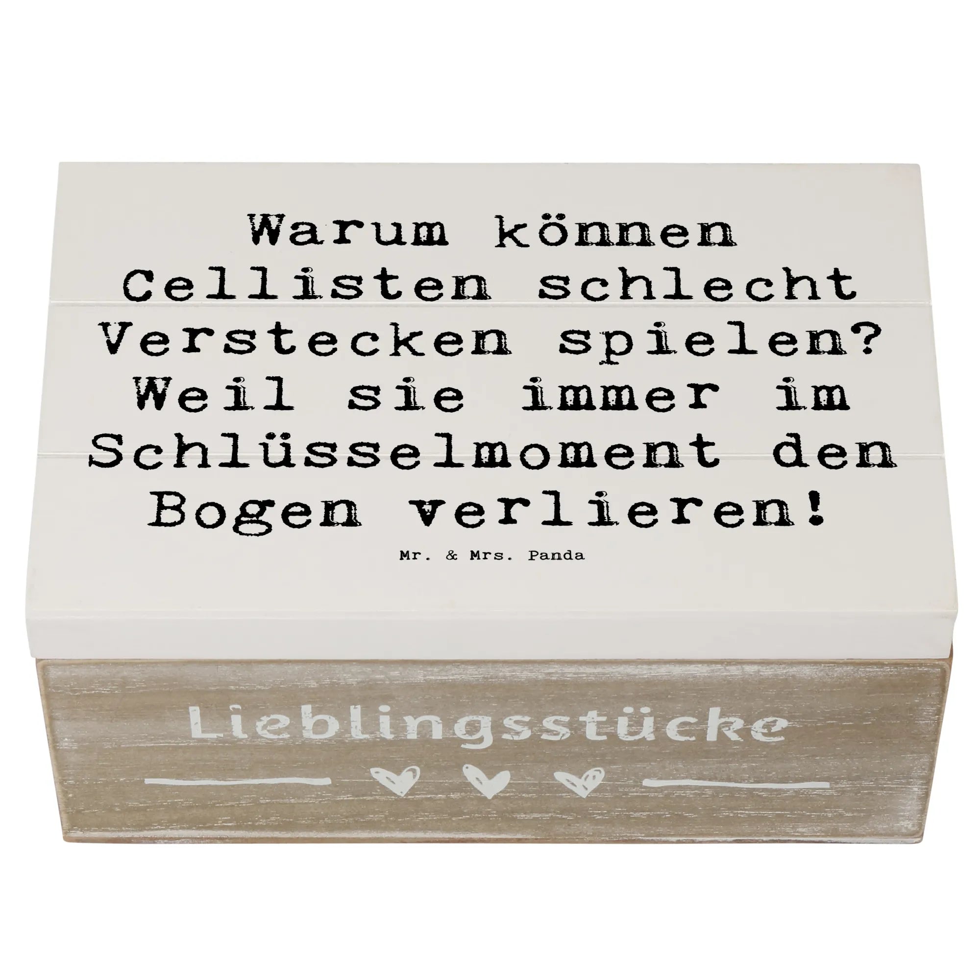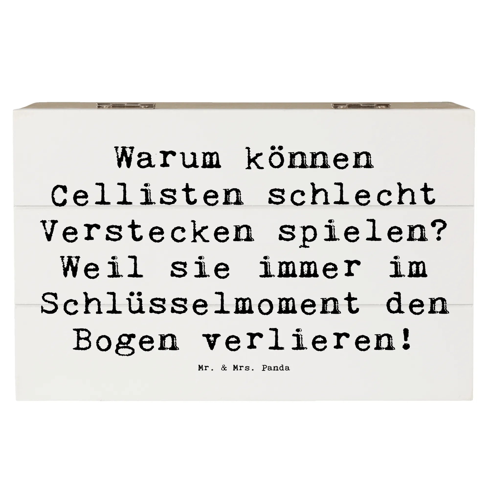 Entdecke die perfekte Holzkiste von Mr. & Mrs. Panda im einzigartigen Cello-Design! Diese wunderschöne Kiste mit dem Spruch "Warum können Cellisten schlecht Verstecken spielen? Weil sie immer im Schlüsselmoment den Bogen verlieren!" bringt nicht nur ein Lächeln auf die Lippen, sondern ist auch das ideale Geschenk für Musikliebhaber und Cellisten.