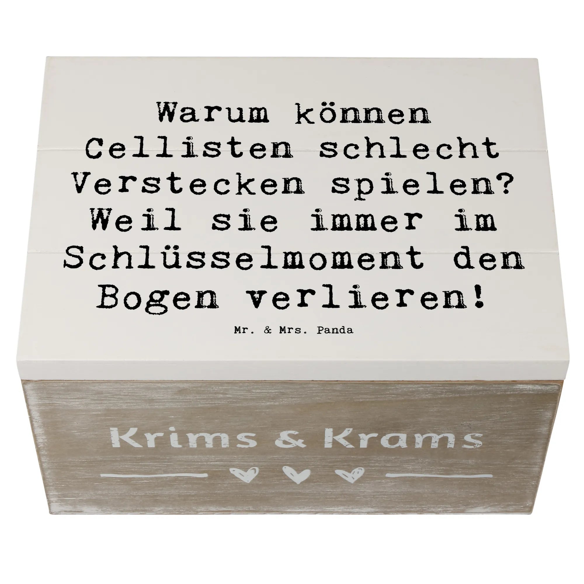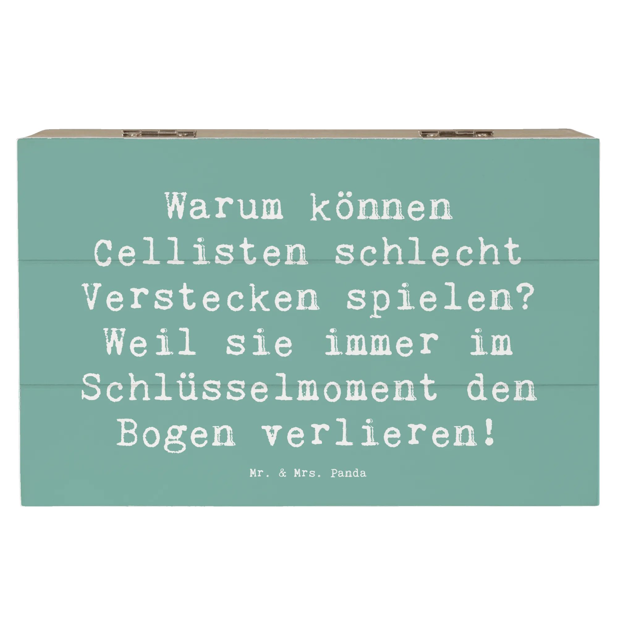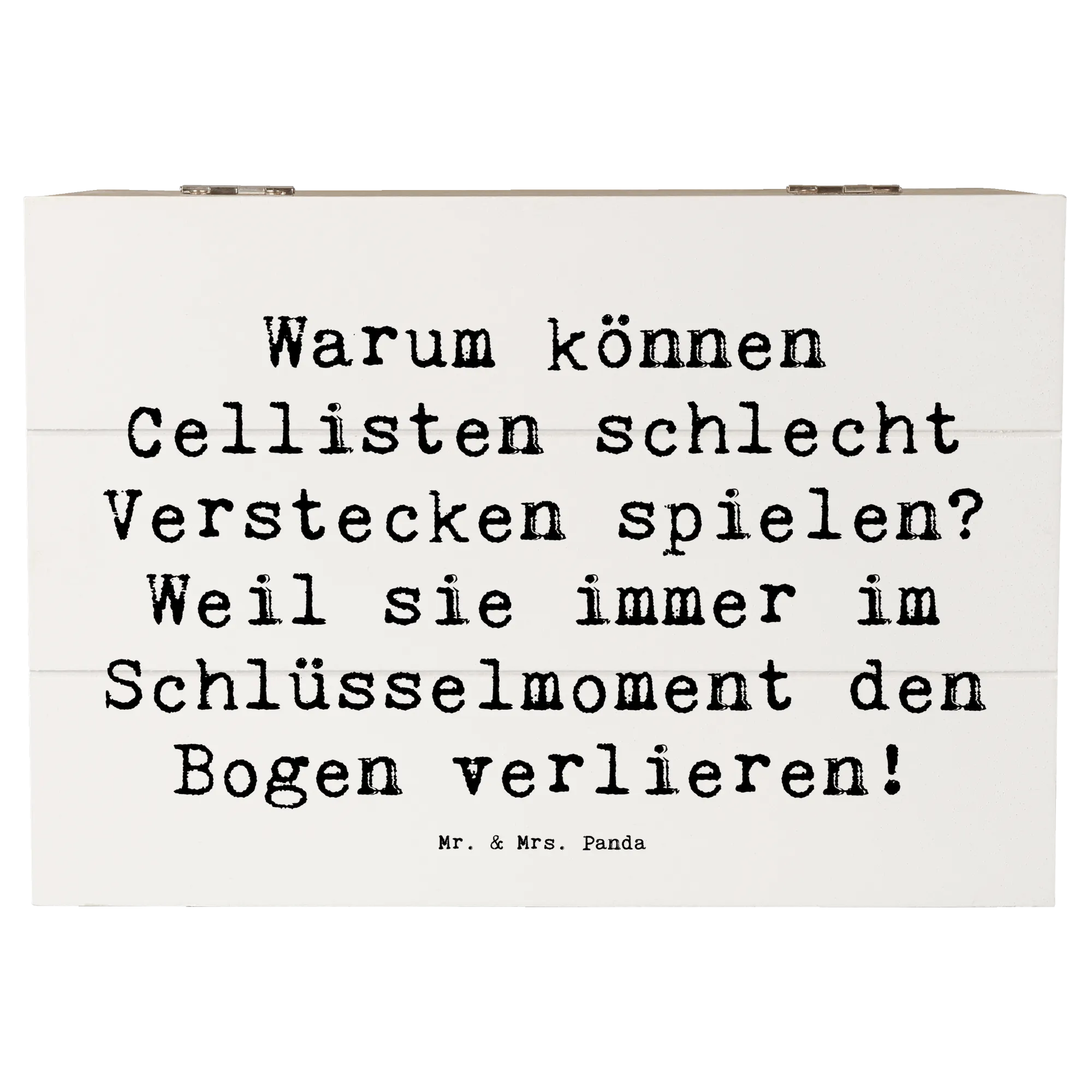 Entdecke die perfekte Holzkiste von Mr. & Mrs. Panda im einzigartigen Cello-Design! Diese wunderschöne Kiste mit dem Spruch "Warum können Cellisten schlecht Verstecken spielen? Weil sie immer im Schlüsselmoment den Bogen verlieren!" bringt nicht nur ein Lächeln auf die Lippen, sondern ist auch das ideale Geschenk für Musikliebhaber und Cellisten.