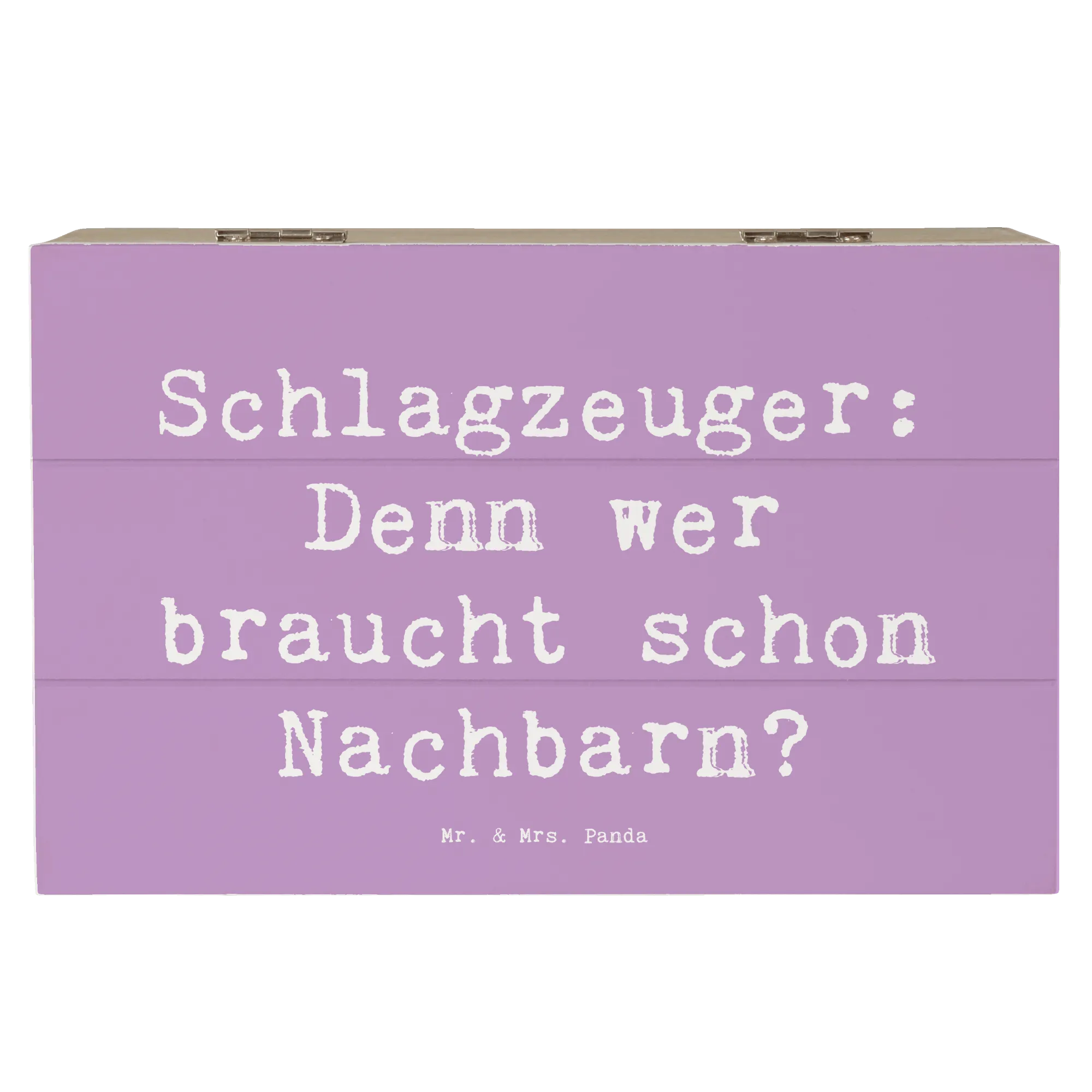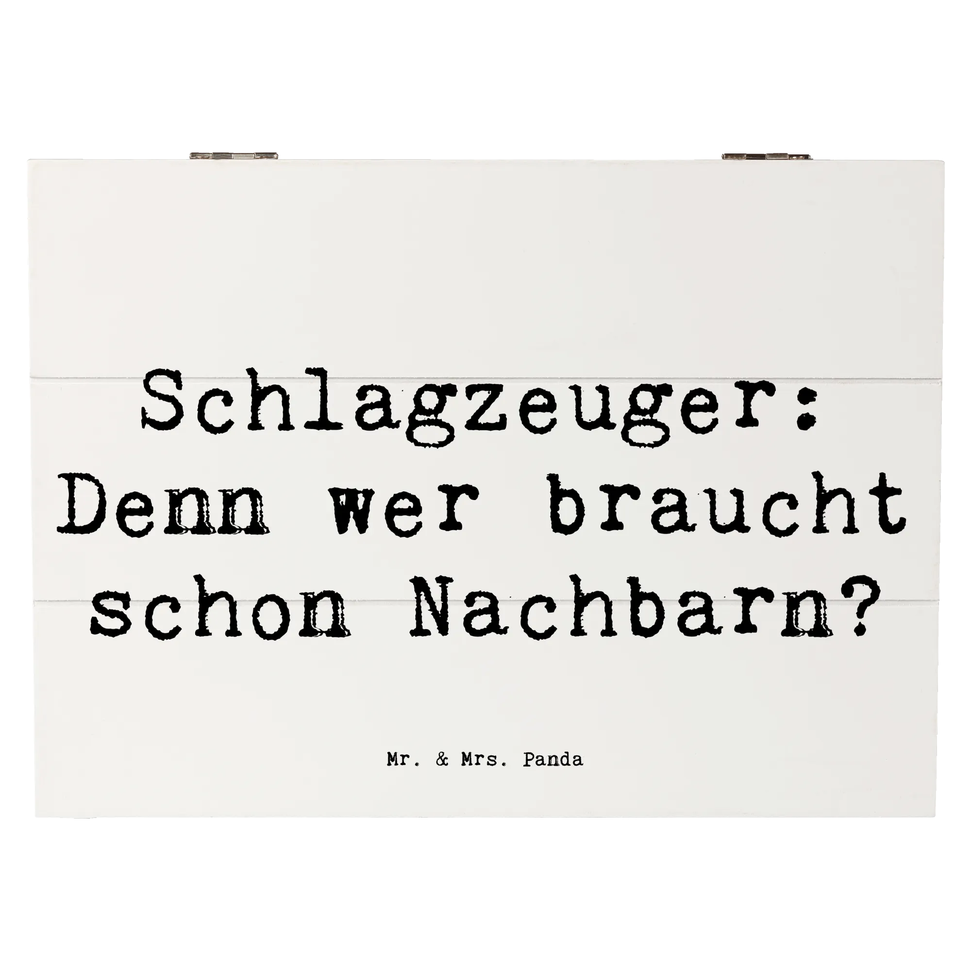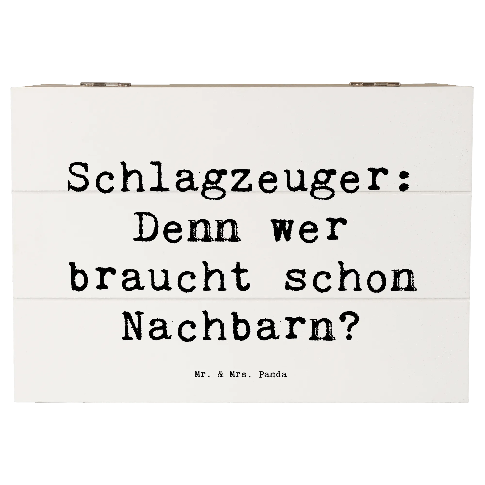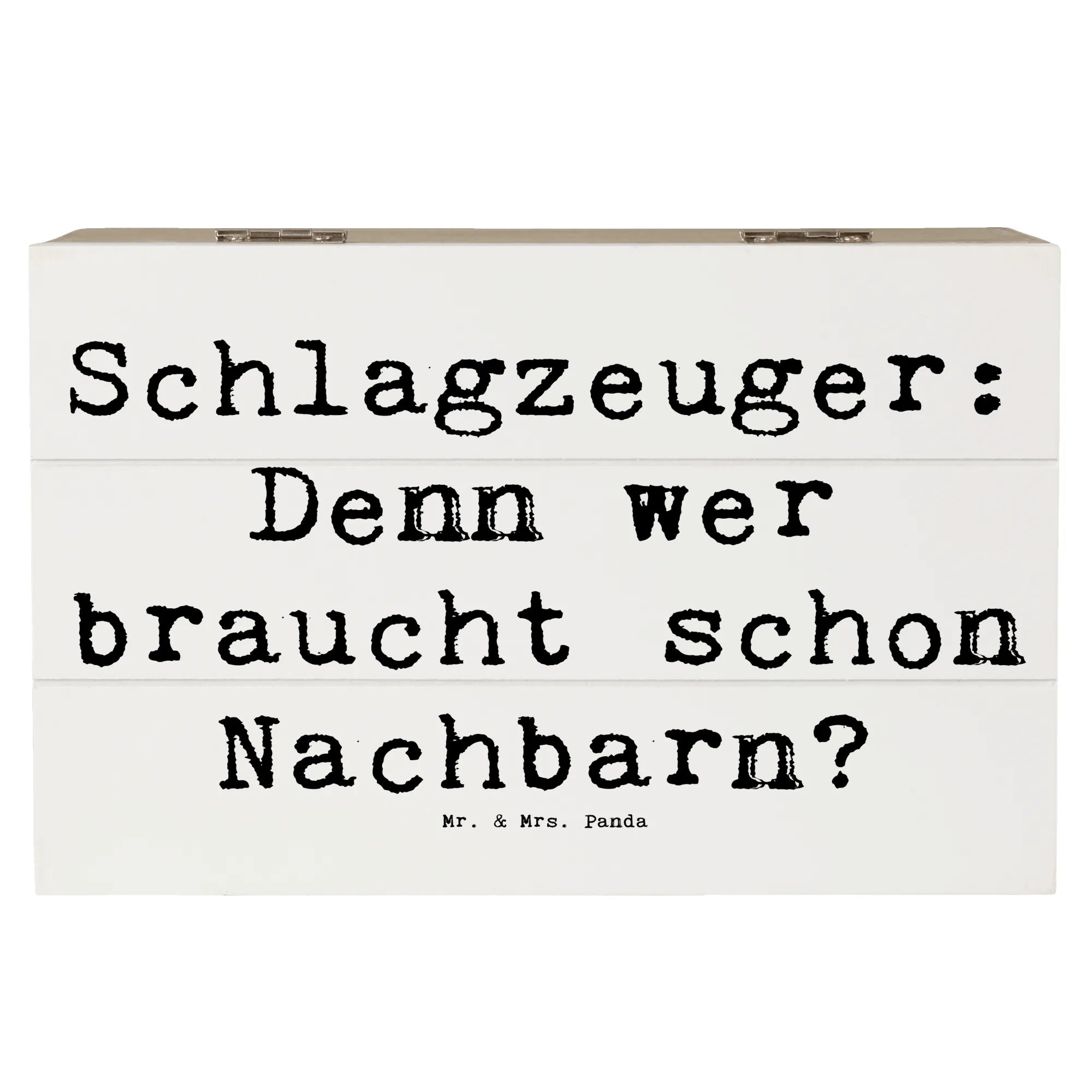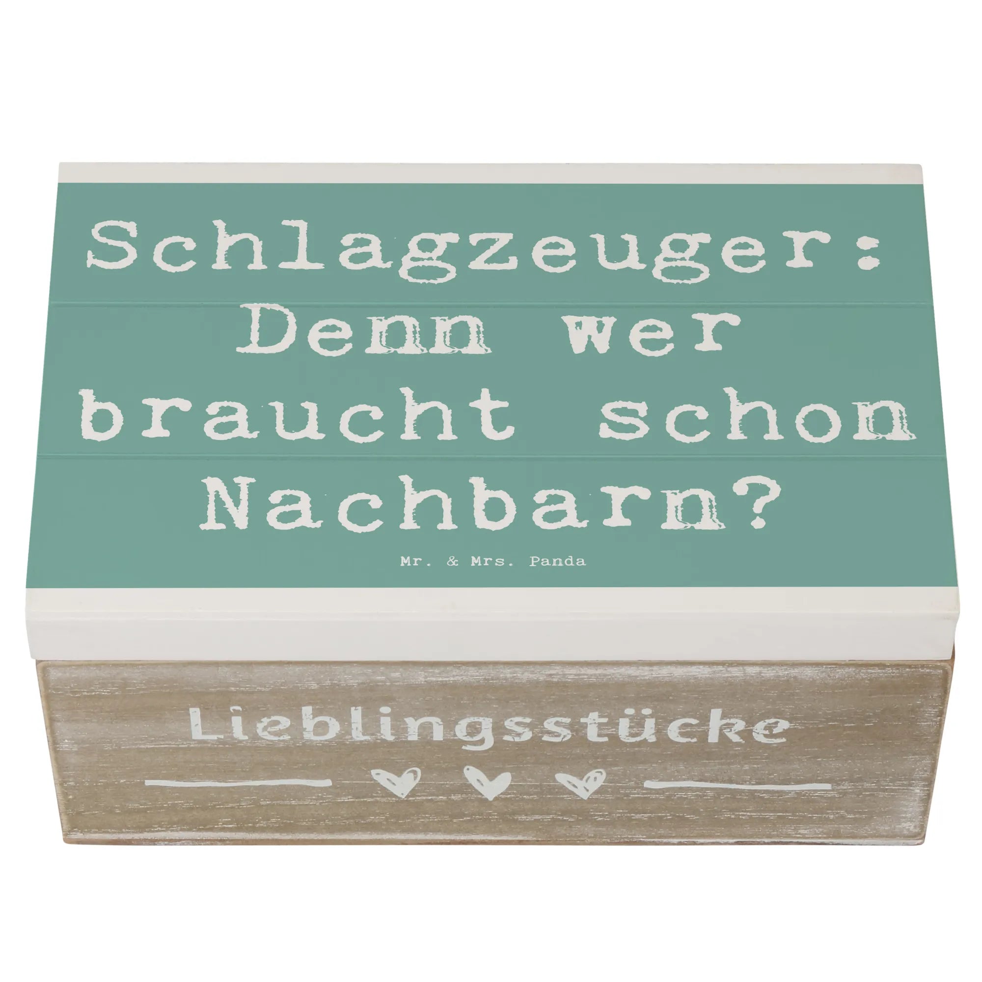 Die besondere Ausstrahlung des Schlagzeugs bringt sofort gute Laune und erinnert an tolle Band-Erlebnisse und gemeinsame Musikstunden. Der humorvolle Spruch "Schlagzeuger: Denn wer braucht schon Nachbarn?" verleiht der Kiste eine persönliche Note und bringt jeden zum Schmunzeln.