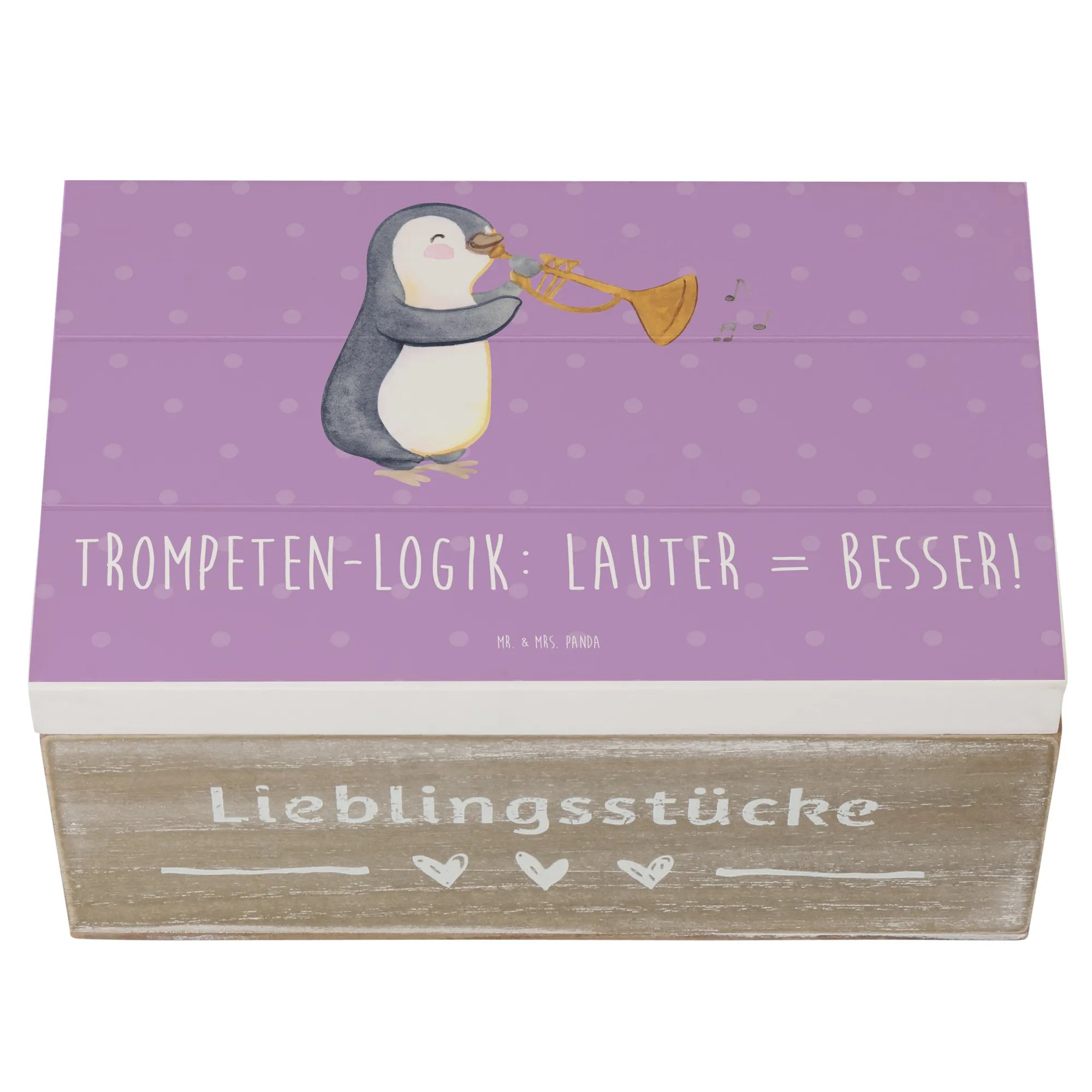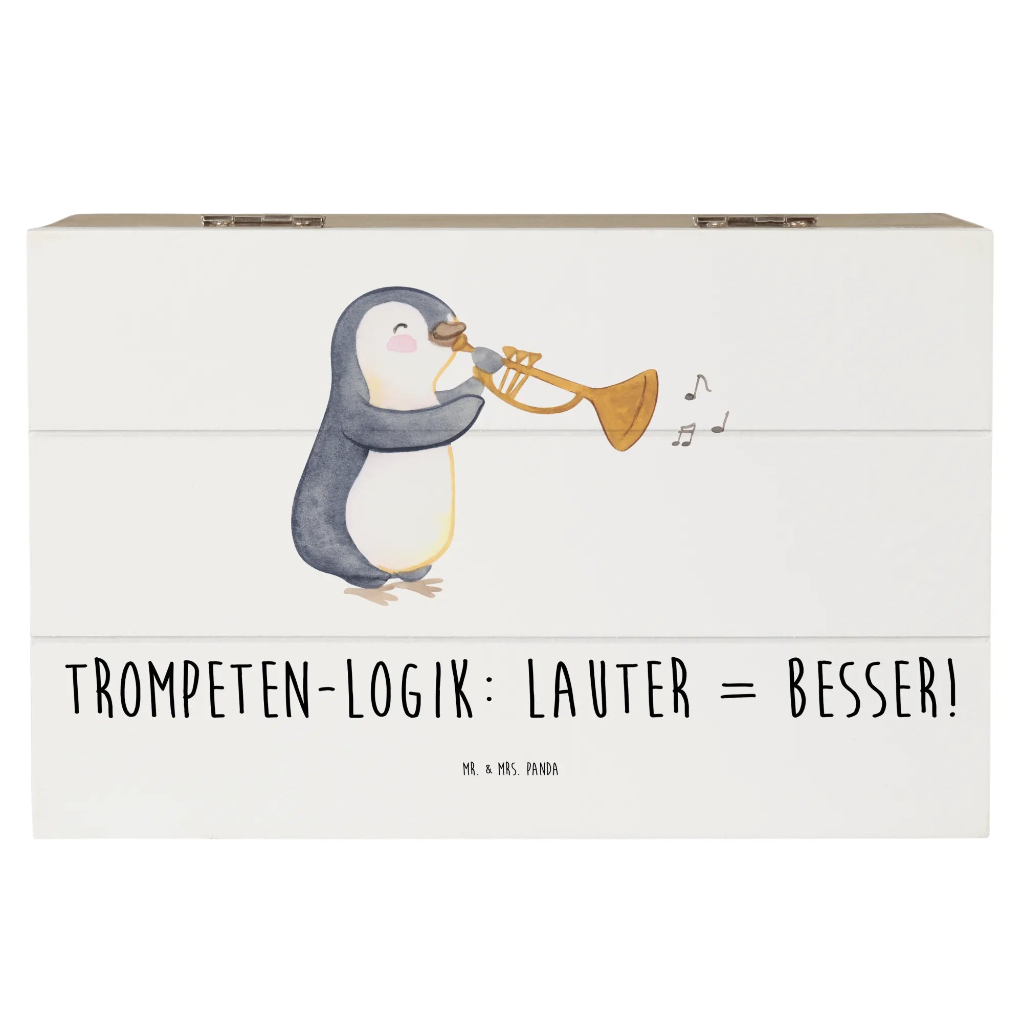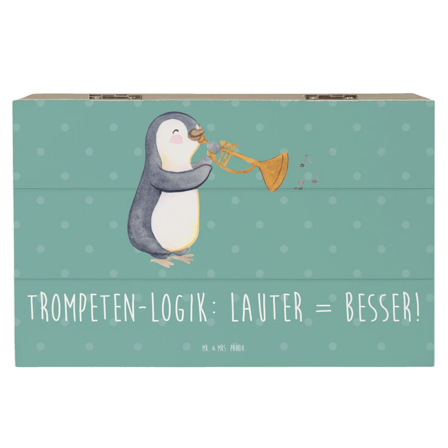 Die wunderschöne Holzkiste von Mr. & Mrs. Panda ist das ideale Geschenk für alle Musikliebhaber und aufstrebenden Musiker. Mit ihrem einzigartigen Motiv der Trompete und dem dazugehörigen spritzigen Slogan "Trompeten-Logik: Lauter = Besser!" ist diese Kiste nicht nur ein echter Blickfang, sondern auch eine wunderbare Möglichkeit, Erinnerungen festzuhalten und zu bewahren.