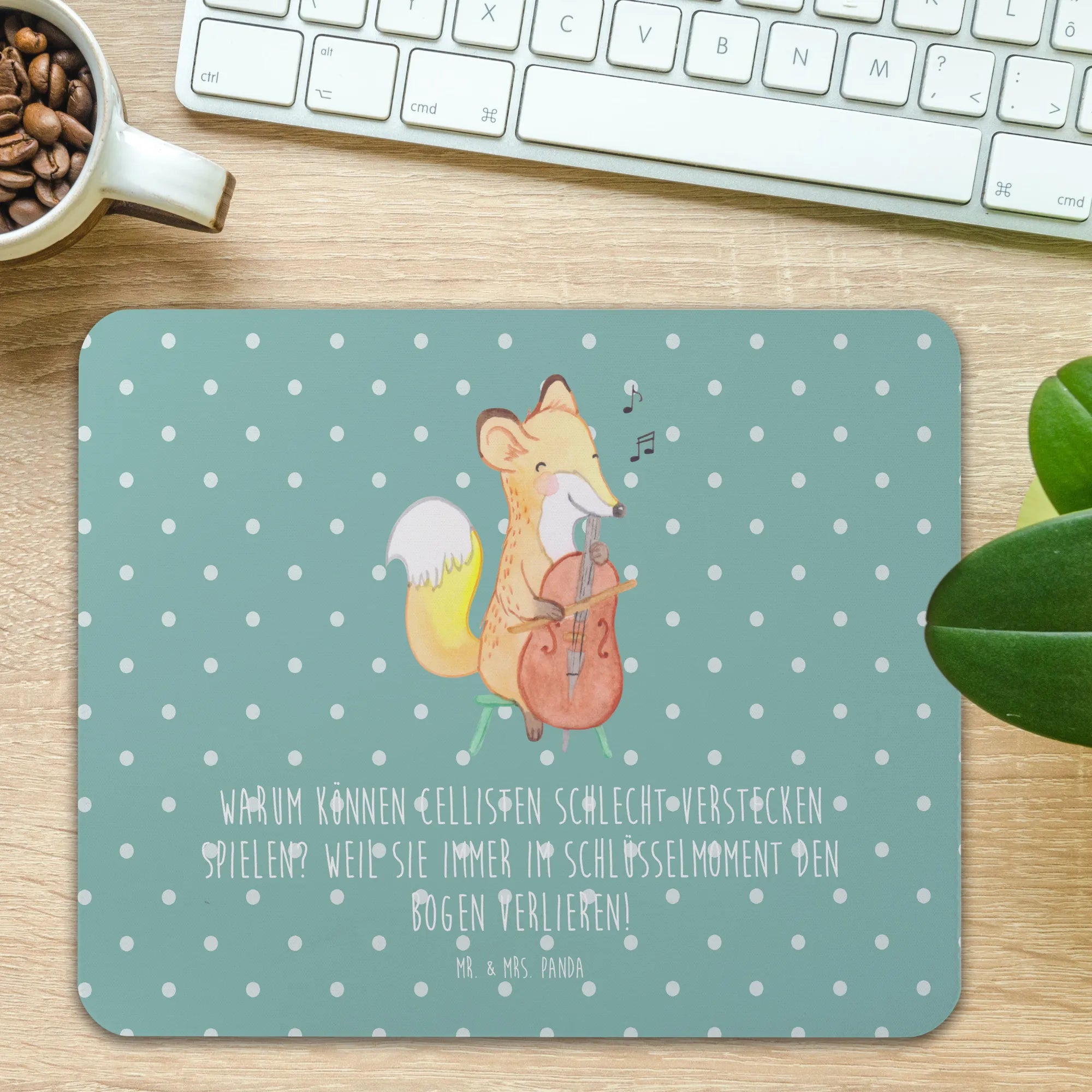 Suchst du nach dem perfekten Geschenk für einen Musikliebhaber oder vielleicht sogar für deinen eigenen Arbeitsplatz? Dann ist das Mauspad mit dem wundervollen Motiv "Cello" aus der Kollektion "Musizieren & Instrumente" von Mr. & Mrs. Panda genau das Richtige! Dieses einzigartige Mauspad – bedruckt mit dem Spruch "Warum können Cellisten schlecht Verstecken spielen? Weil sie immer im Schlüsselmoment den Bogen verlieren!" – bringt nicht nur einen Hauch von Humor in dein Homeoffice oder Büro, sondern auch eine große Portion Stil.