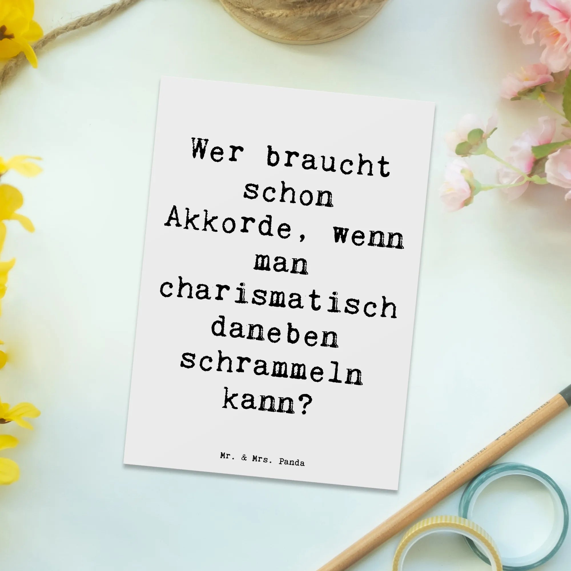 Egal, ob der Empfänger ein akustischer Gitarrist, ein elektrischer Rocker oder einfach nur ein Musikfan ist, diese Karte wird ihre Begeisterung wecken. Mit der humorvollen Botschaft "Wer braucht schon Akkorde, wenn man charismatisch daneben schrammeln kann?" versprüht diese Karte einen gewissen Charme, der jeden Musikliebhaber zum Schmunzeln bringen wird.