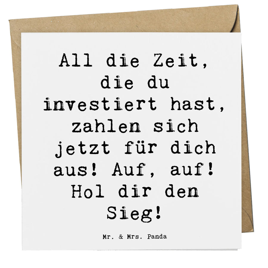 Diese hochwertige, quadratische Grußkarte misst 140 mm x 140 mm und ist aus feinstem 300 Gramm Karton gefertigt, der nicht nur stabil, sondern auch unglaublich edel wirkt. Die Vorderseite der Karte ist hochglänzend veredelt und besticht durch einen ansprechenden Spruch: 'All die Zeit, die du investiert hast, zahlen sich jetzt für dich aus! Auf, auf! Hol dir den Sieg!'.