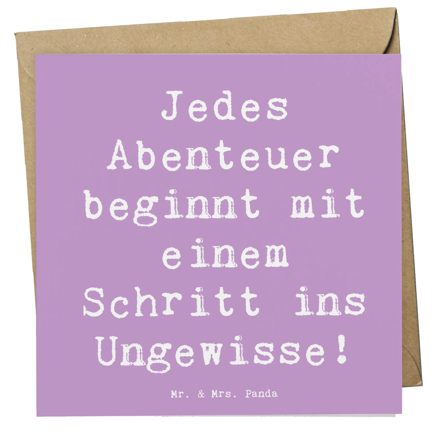 Die hochwertige Klappkarte mit einer Größe von 140 mm x 140 mm wurde aus edlem 300 Gramm Karton gefertigt und besticht durch ihre matte, elegante Optik. Auf der Vorderseite findest du den inspirierenden Spruch "Jedes Abenteuer beginnt mit einem Schritt ins Ungewisse!", der gerade in unsicheren Zeiten zum Nachdenken anregt und Hoffnung schenkt.