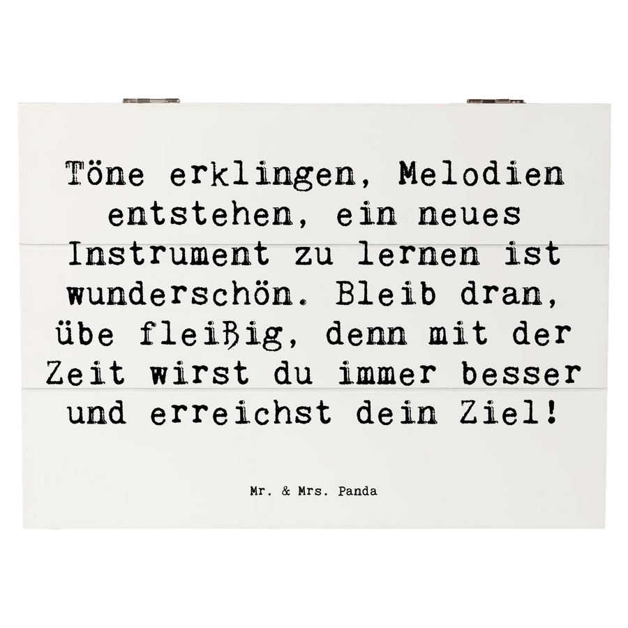 Entdecke die wunderschöne Holzkiste von Mr. & Mrs. Panda, die mit dem inspirierenden Spruch "Töne erklingen, Melodien entstehen, ein neues Instrument zu lernen ist wunderschön. Bleib dran, übe fleißig, denn mit der Zeit wirst du immer besser und erreichst dein Ziel!" versehen ist.