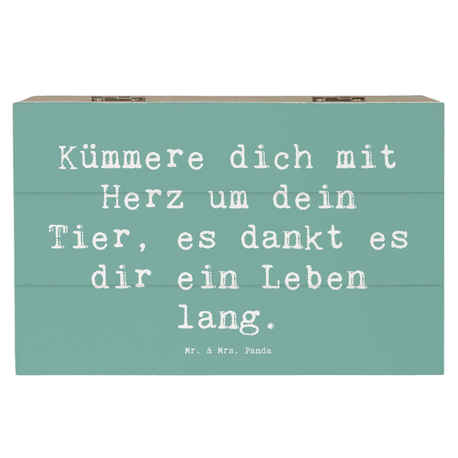 Auf der Kiste findest du den Mutmacher-Slogan: 'Kümmere dich mit Herz um dein Tier, es dankt es dir ein Leben lang.' Dieser Spruch erinnert dich immer wieder daran, wie wichtig der liebevolle Umgang mit unseren vierbeinigen Freunden ist.