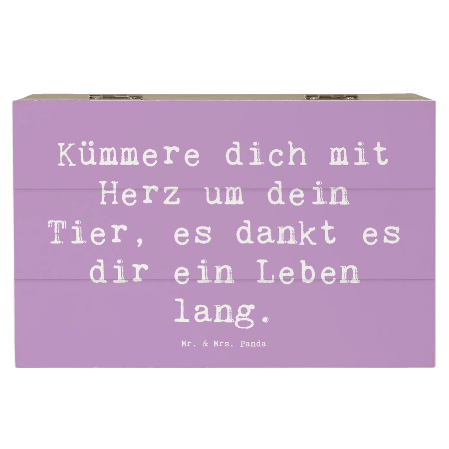 Auf der Kiste findest du den Mutmacher-Slogan: 'Kümmere dich mit Herz um dein Tier, es dankt es dir ein Leben lang.' Dieser Spruch erinnert dich immer wieder daran, wie wichtig der liebevolle Umgang mit unseren vierbeinigen Freunden ist.