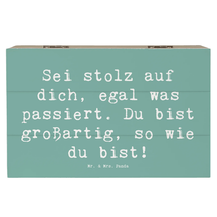 Eine kleine Kiste mit großer Wirkung: Unsere Holzkiste aus der Mutmacher-Kollektion von Mr. & Mrs. Panda ist mehr als nur eine Erinnerungskiste – sie ist ein mutmachendes Zeichen für alle, die gerade mit Enttäuschungen umgehen müssen. Bedruckt mit dem liebevollen Spruch „Sei stolz auf dich, egal was passiert. Du bist großartig, so wie du bist!“, schenkt sie Zuversicht und Wärme, genau dann, wenn sie gebraucht wird. 😊