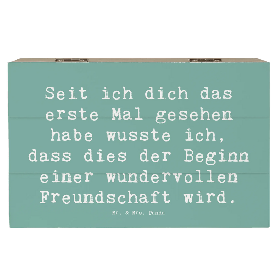 Der besondere Spruch "Seit ich dich das erste Mal gesehen habe, wusste ich, dass dies der Beginn einer wundervollen Freundschaft wird." macht diese Kiste zu einem perfekten Mutmacher und gibt jedem Anlass eine emotionale Note. Die robuste Bauweise und die Einschlagscharniere ermöglichen ein einfaches Öffnen und Schließen, sodass Du jederzeit leicht an Deine Erinnerungen kommst.