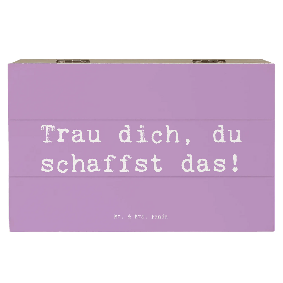Die wunderschöne Holzkiste von Mr. & Mrs. Panda mit dem Motiv 'Angst überwinden' ist mehr als nur eine Aufbewahrungsbox – sie ist ein wahrhaftiger Mutmacher! Jedes Mal, wenn Du diese Kiste öffnest, wirst Du daran erinnert, dass Du Deine Ängste besiegen kannst und dass Du die Kraft hast, alles zu erreichen, was Du Dir wünschst. Mit dem inspirierenden Slogan 'Trau dich, du schaffst das!' im Inneren, ist diese Kiste der perfekte Ort für all die kleinen und großen Schätze deines Lebens!