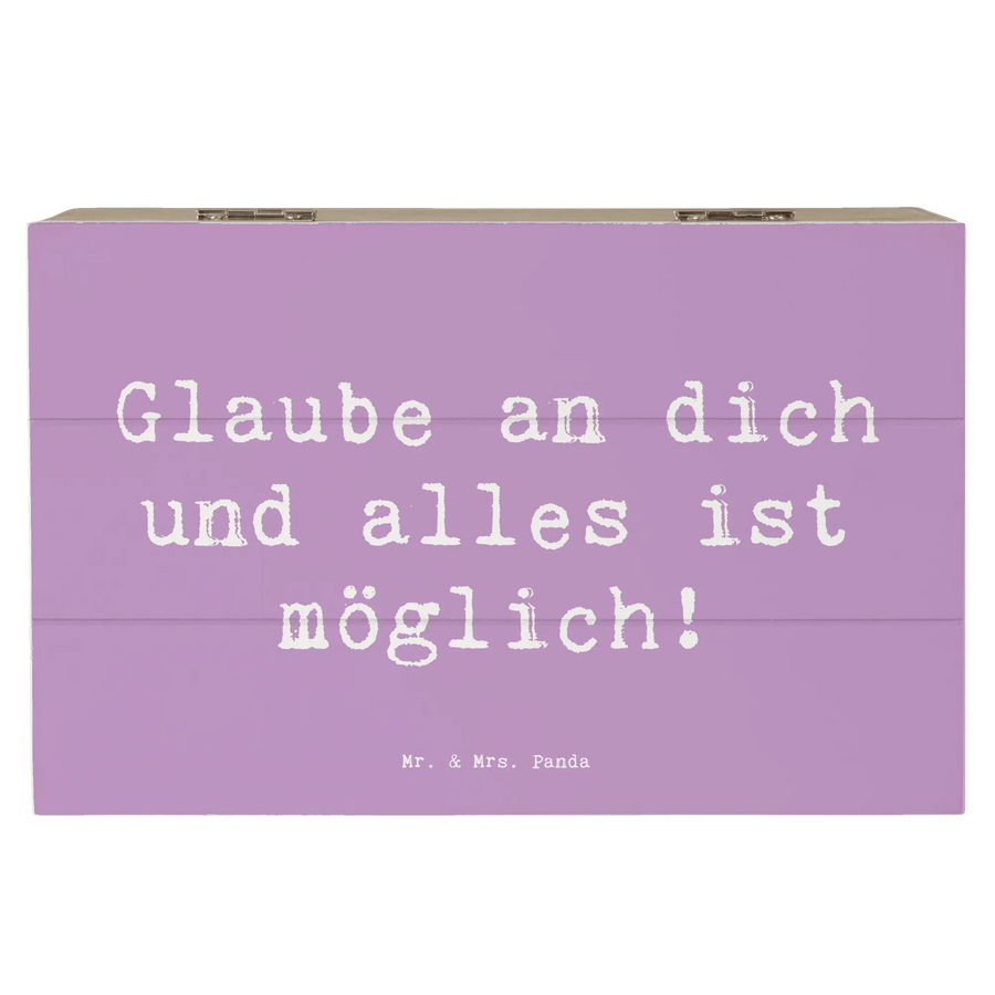 Entdecke die wunderschöne Holzkiste von Mr. & Mrs. Panda, die mit dem motivierenden Spruch "Glaube an dich und alles ist möglich!" versehen ist. Diese Erinnerungskiste symbolisiert Vertrauen in eigene Fähigkeiten und ermutigt uns, an uns selbst zu glauben.