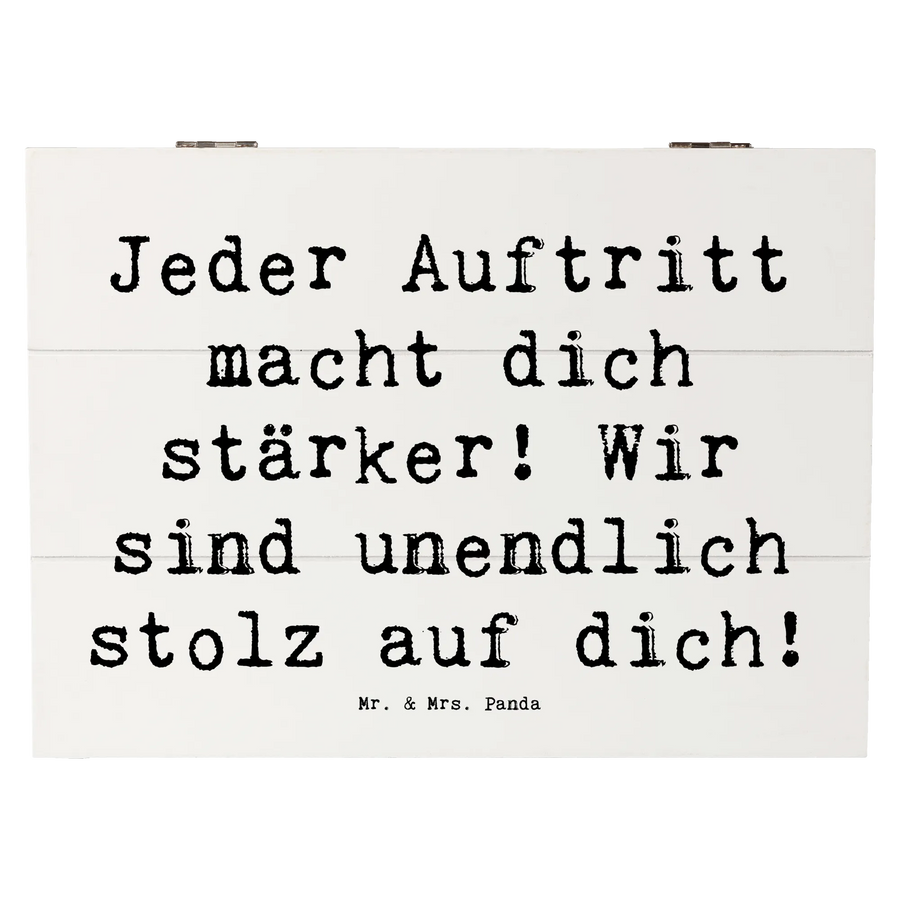 Mit dem aufgedruckten Spruch "Jeder Auftritt macht dich stärker! Wir sind unendlich stolz auf dich!" bekommst du eine Botschaft, die den Empfänger ermutigt und stärkt. Diese Holzkiste ist nicht nur ein schöner Blickfang, sondern auch eine nachhaltige und wiederverwendbare Geschenkbox, die mit Liebe gefüllt werden kann.