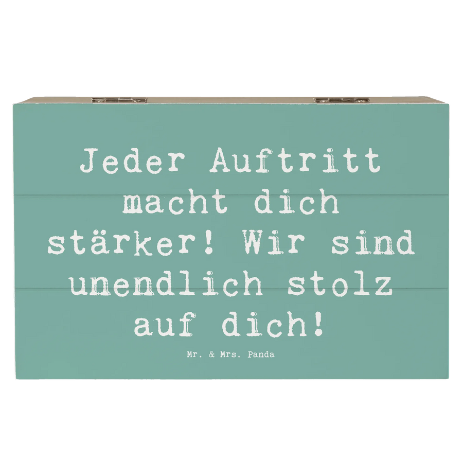 Mit dem aufgedruckten Spruch "Jeder Auftritt macht dich stärker! Wir sind unendlich stolz auf dich!" bekommst du eine Botschaft, die den Empfänger ermutigt und stärkt. Diese Holzkiste ist nicht nur ein schöner Blickfang, sondern auch eine nachhaltige und wiederverwendbare Geschenkbox, die mit Liebe gefüllt werden kann.