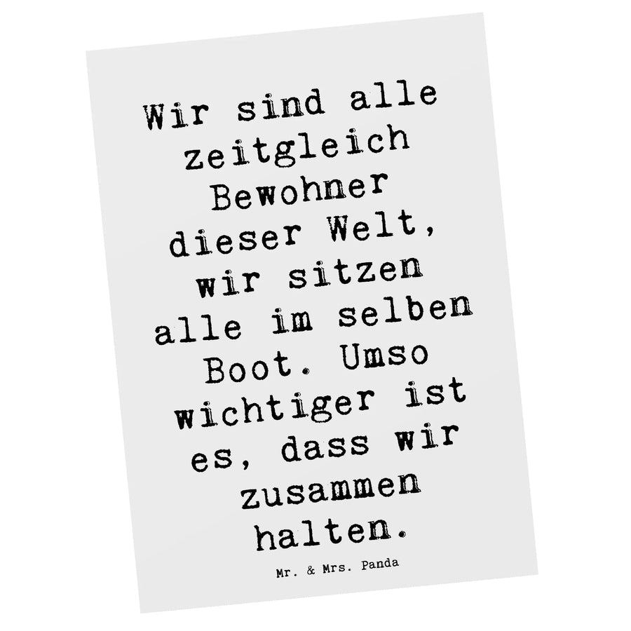 Entdecke die wunderschöne Postkarte "Freundlichkeiten verbreiten" aus der einzigartigen Mutmacher-Kollektion von Mr. & Mrs. Panda! Diese Karte ist nicht nur ein hübsches Kunstwerk, sondern auch eine wundervolle Möglichkeit, Liebe und Zuversicht zu verbreiten. Die Botschaft „Wir sind alle zeitgleich Bewohner dieser Welt, wir sitzen alle im selben Boot. Umso wichtiger ist es, dass wir zusammen halten.“ bringt Menschen zusammen und ermutigt sie, sich gegenseitig zu unterstützen.