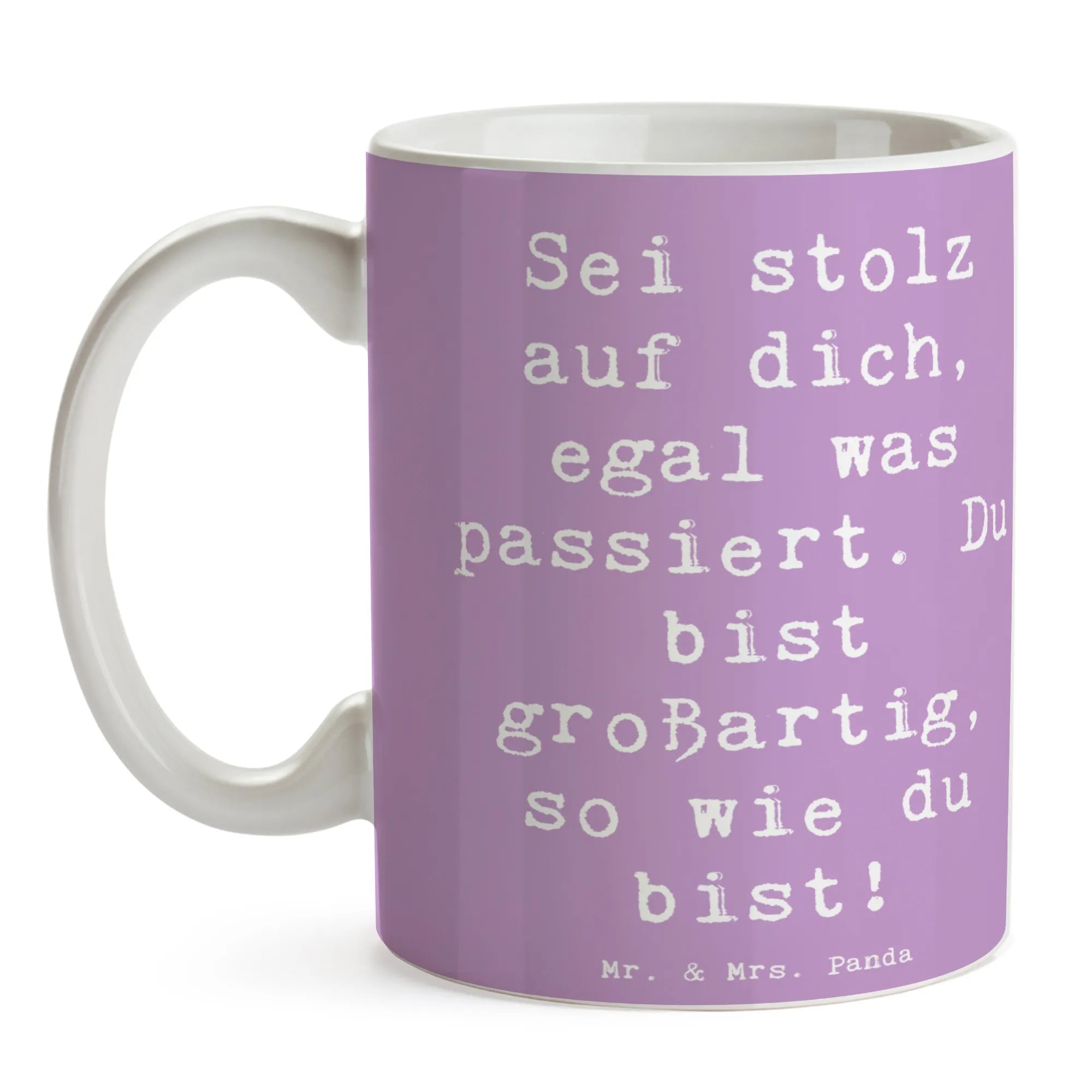 Suchst du ein Geschenk, das tröstet, stärkt und ein Lächeln schenkt? Unsere Mr. & Mrs. Panda Tasse aus der Mutmacher-Kollektion ist genau das: eine liebevoll gestaltete Geschenktasse mit dem ermutigenden Spruch „Sei stolz auf dich, egal was passiert. Du bist großartig, so wie du bist!” auf einem zarten Lavendeltraum-Hintergrund. 🌸