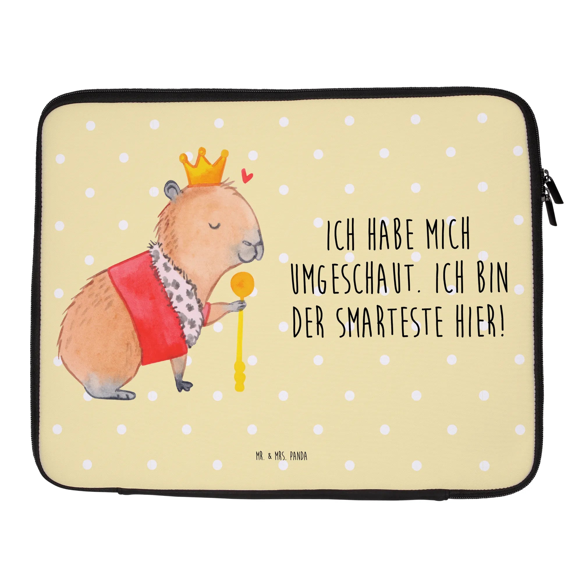 Diese besondere Tasche ist nicht nur ein echter Hingucker, sondern auch ein praktisches Accessoire für jeden, der sein Notebook sicher transportieren möchte. Handgezeichnet von Mrs. Panda selbst, zeigt das Design ein charmantes Capybara, das mit einer goldenen Krone und einem purpurroten Mantel ausgestattet ist. Der königliche Look wird durch das kleine Herzchen über dem Kopf perfekt ergänzt.