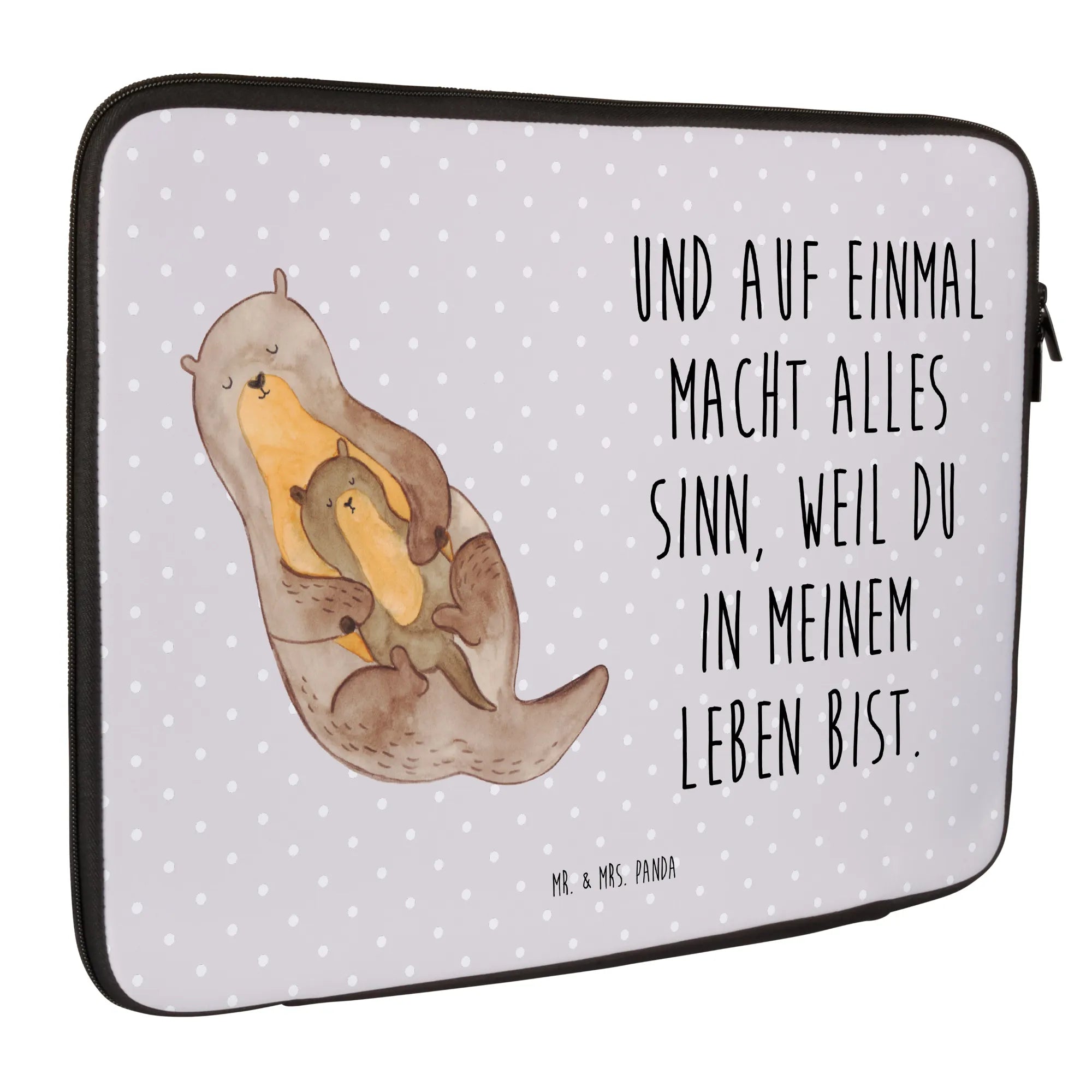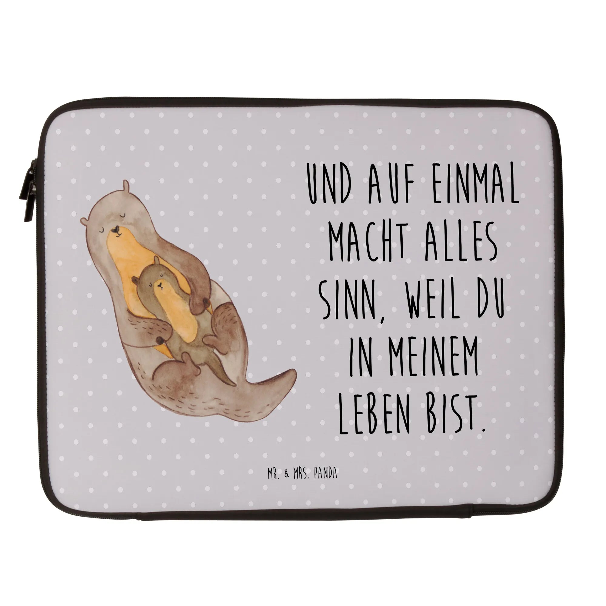 Entdecke unsere wunderschöne Notebook Tasche "Otter mit Kind" aus der Otter - Kollektion von Mr. & Mrs. Panda! Diese leichte und stilvolle Computertasche ist der perfekte Begleiter für jedes Abenteuer. Der süße Otter, der seinen kleinen Otter auf dem Bauch hat, verkörpert ein Gefühl von Wärme und Geborgenheit, das jeden in seinen Bann zieht. Mit dem Spruch "Und auf einmal macht alles Sinn, weil du in meinem Leben bist" führt diese Tasche nicht nur das niedliche Motiv, sondern auch eine besondere Botschaft mit sich.