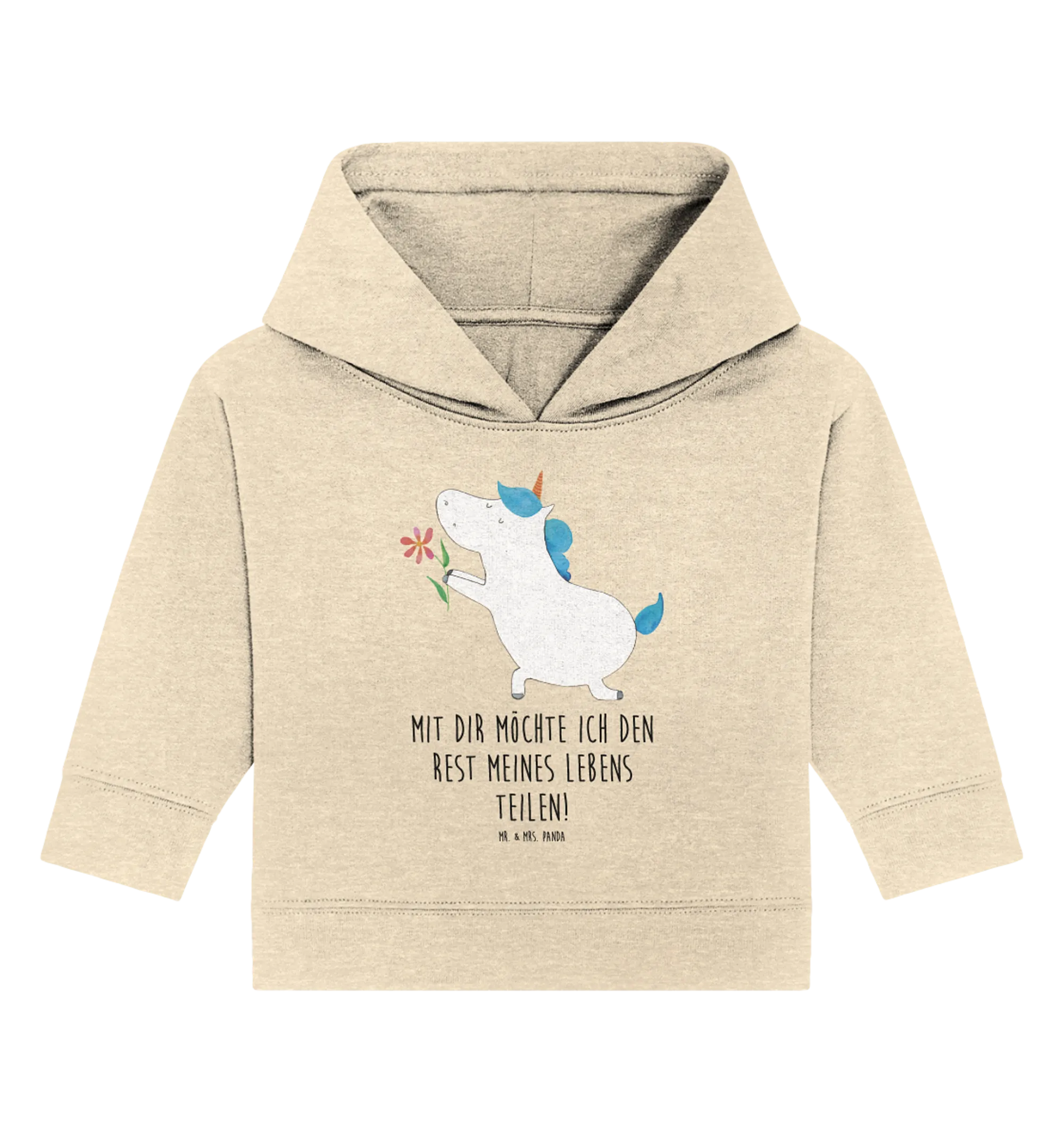Das entzückende Einhorn-Motiv, das liebevoll von Mrs. Panda handgezeichnet wurde, zeigt ein niederkniendes Einhorn, das einer Blume entgegenhält – eine zauberhafte Botschaft der Liebe und Zuneigung. Mit dem besonderen Slogan "Mit dir möchte ich den Rest meines Lebens teilen!" wird dieses Hoodie zu einem ganz persönlichen Liebesbeweis – perfekt für das eigene Kind oder als niedliches Geschenk für frischgebackene Eltern. Ideal für Anlässe wie Verlobungen, Hochzeiten oder einfach nur um den kleinen Liebling etwas Gutes zu tun.