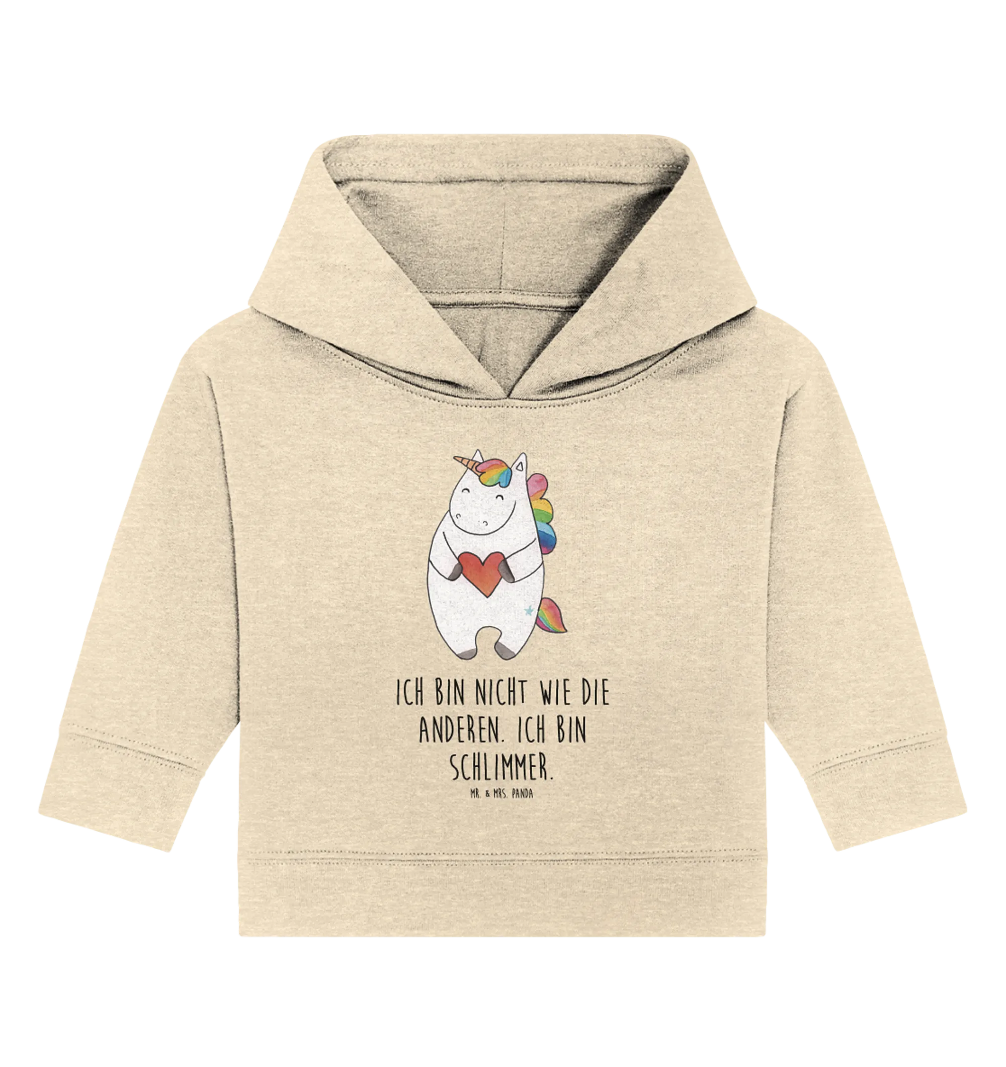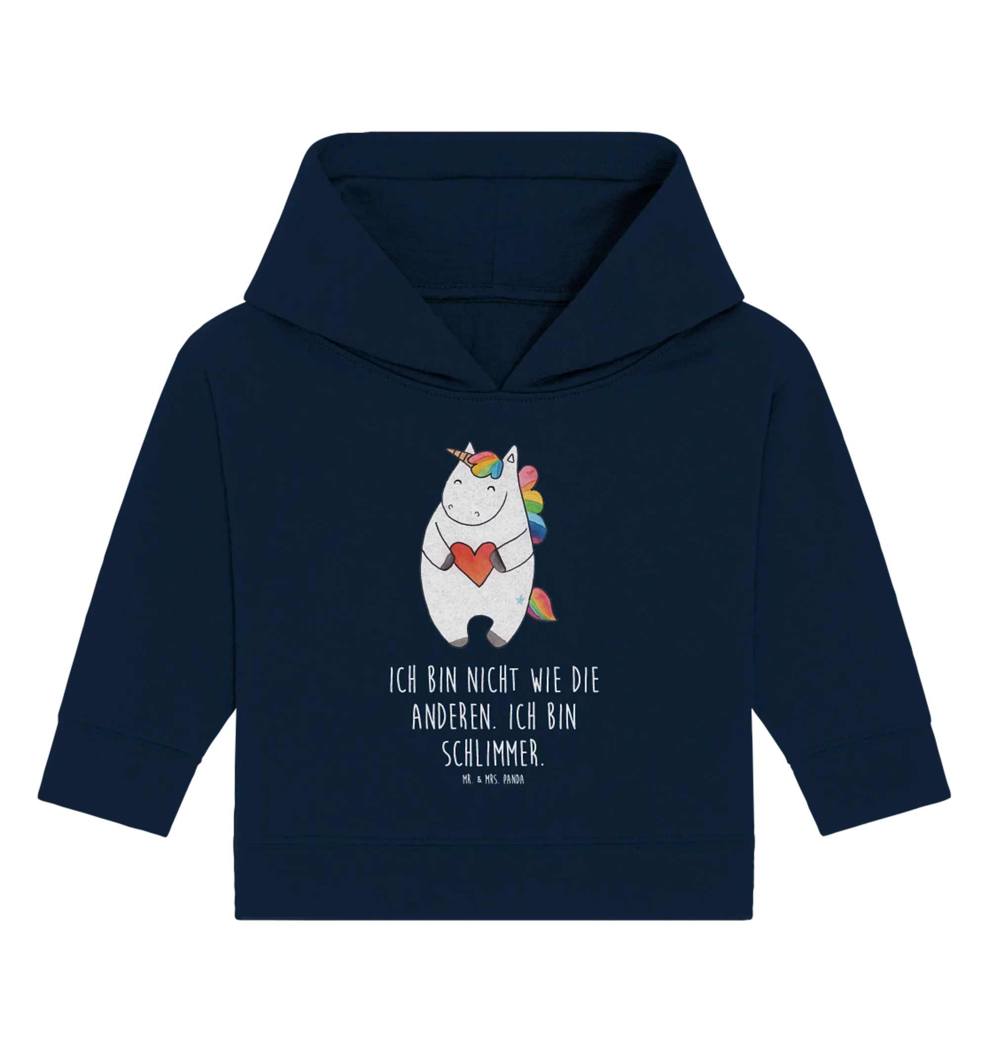 Das Organic Baby Hoodie mit dem zauberhaften Einhorn Herz aus der Einhorn-Kollektion ist das perfekte Geschenk für kleine Einhorn-Liebhaber und ihre Eltern. Egal ob für den ersten Geburtstag, zur Taufe oder einfach nur als liebevolles Überraschungsgeschenk zwischendurch – dieses Kapuzenshirt bringt garantiert ein Lächeln auf die Gesichter. Das süße Einhorn, das ein Herz in der Hand hält, hat nicht nur einen freundlichen, sondern auch einen witzigen Charakter, denn es besitzt faustdick hinter den Ohren. Mit dem Spruch 'Ich bin nicht wie die Anderen. Ich bin schlimmer.' vermittelt es eine ganz besondere Botschaft, die humorvoll für Aufsehen sorgt.