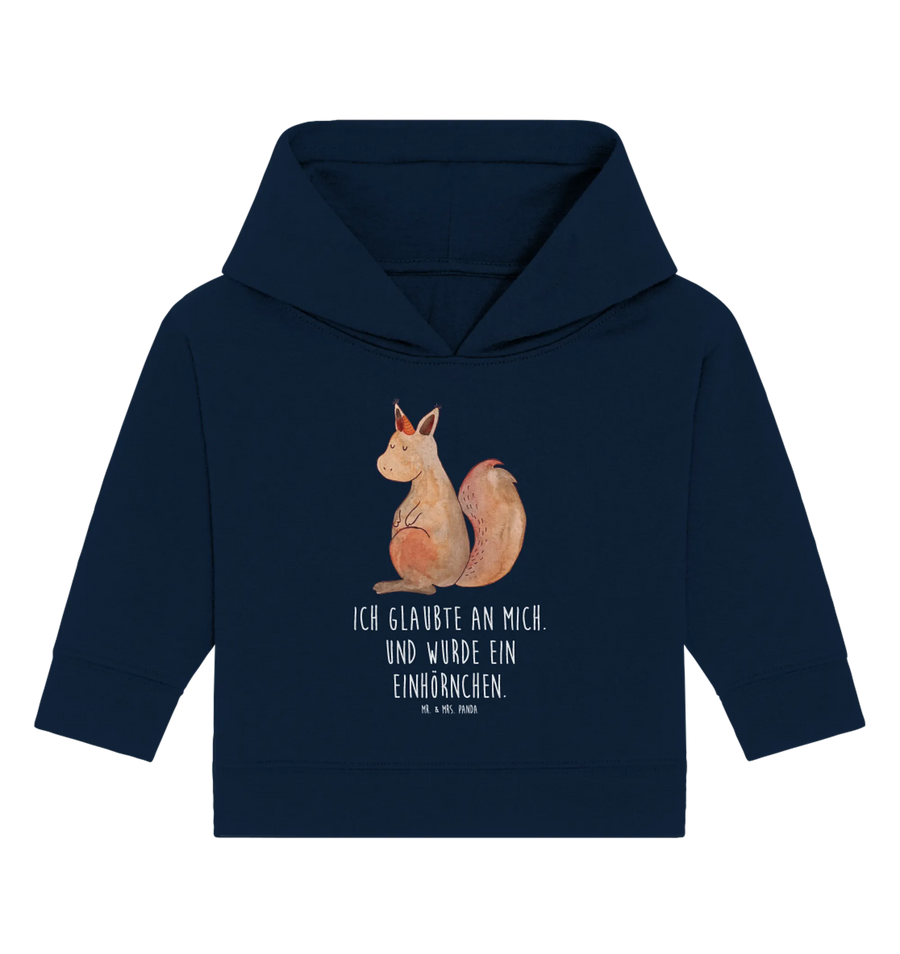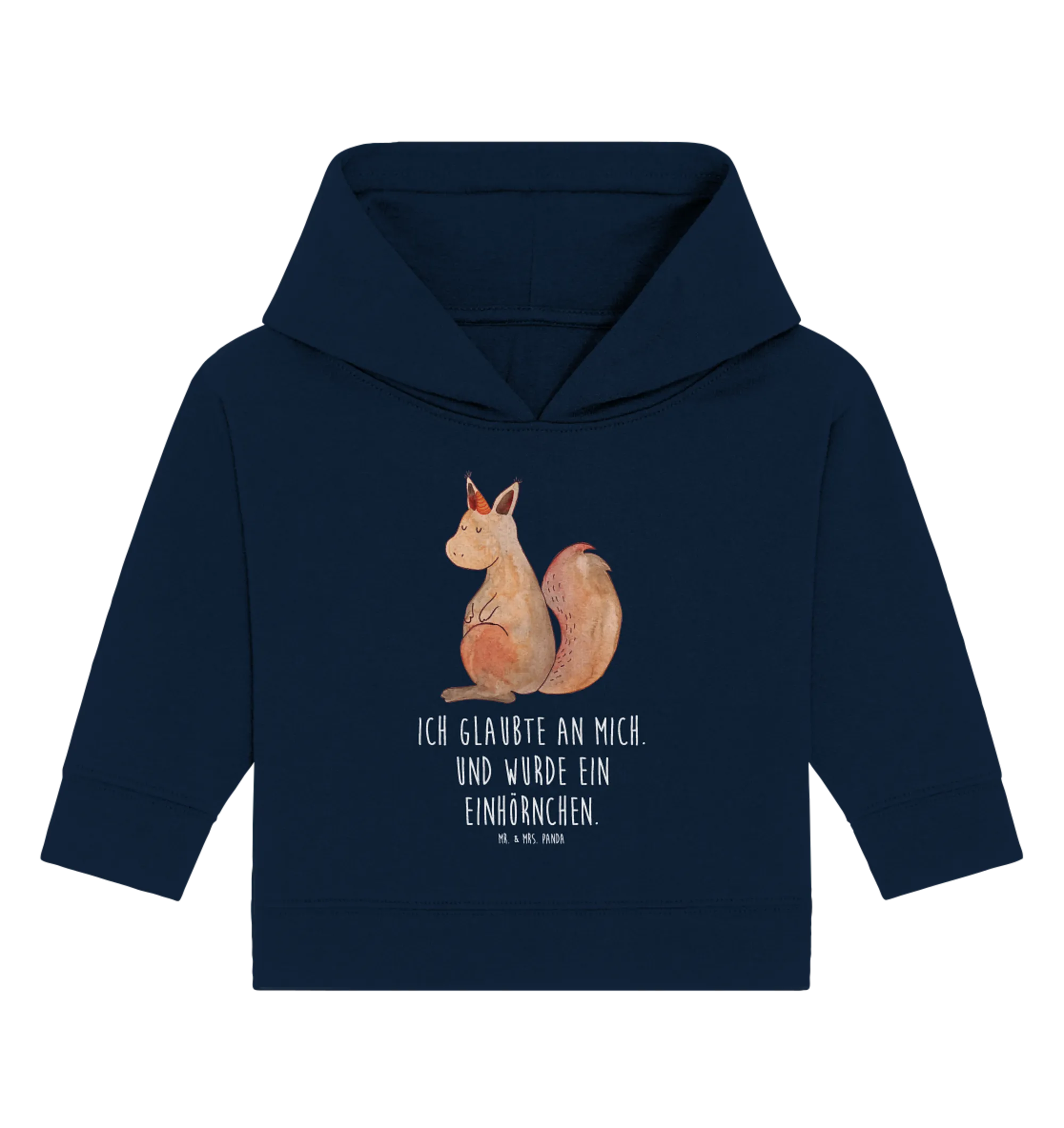 Das liebevoll handgezeichnete Motiv zeigt ein süßes Eichhörnchen mit einem Horn, das zum Träumen und Glauben an die eigene Fantasie anregt. Garniert mit dem inspirierenden Slogan 'Ich glaubte an mich. Und wurde ein Einhörnchen.' ist dieser Baby Hoodie nicht nur ein Kleidungsstück, sondern auch eine Botschaft voller positiver Energie.