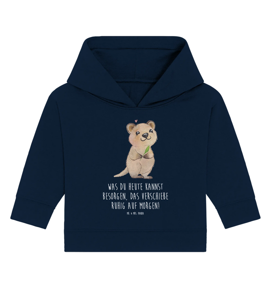 Das Quokka erinnert uns daran, dass es in Ordnung ist, Dinge ein wenig gelassener angehen zu lassen. Daher ist der Spruch "Was du heute kannst besorgen, das verschiebe ruhig auf morgen!" eine charmante Ergänzung für alle kleinen Aufschieber. Ob als Geschenk zur Geburt, zur Taufe oder zum ersten Geburtstag, dieser Baby Hoodie wird sicher für strahlende Augen sorgen!