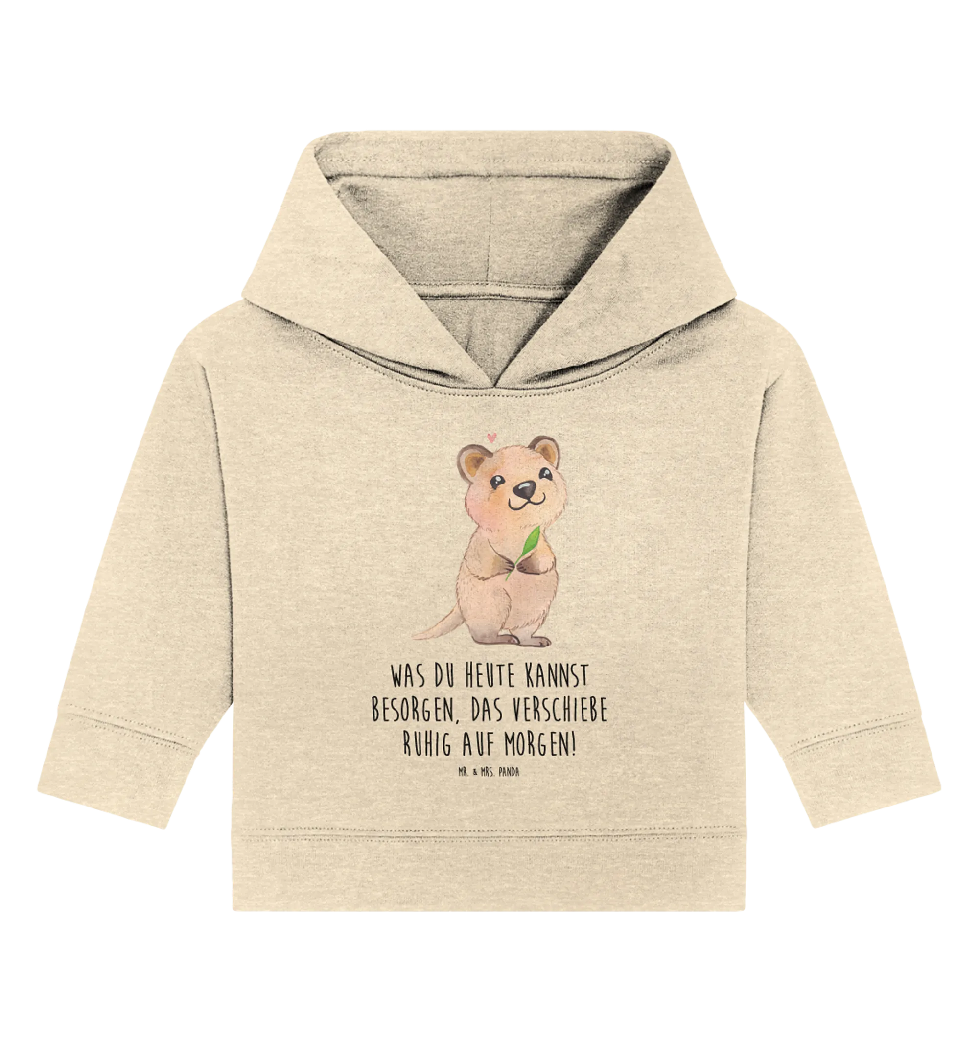 Dieses niedliche Baby Kapuzenshirt aus der Small World Kollektion von Mr. & Mrs. Panda vereint ein zauberhaftes Tiermotiv mit einem frechen, lustigen Spruch: „Was du heute kannst besorgen, das verschiebe ruhig auf morgen!“ 😄 Das Quokka steht aufrecht, lächelt freundlich, hält ein grünes Blatt und hat ein kleines rosa Herz über dem Kopf – ein Motiv, das sofort gute Laune verbreitet.