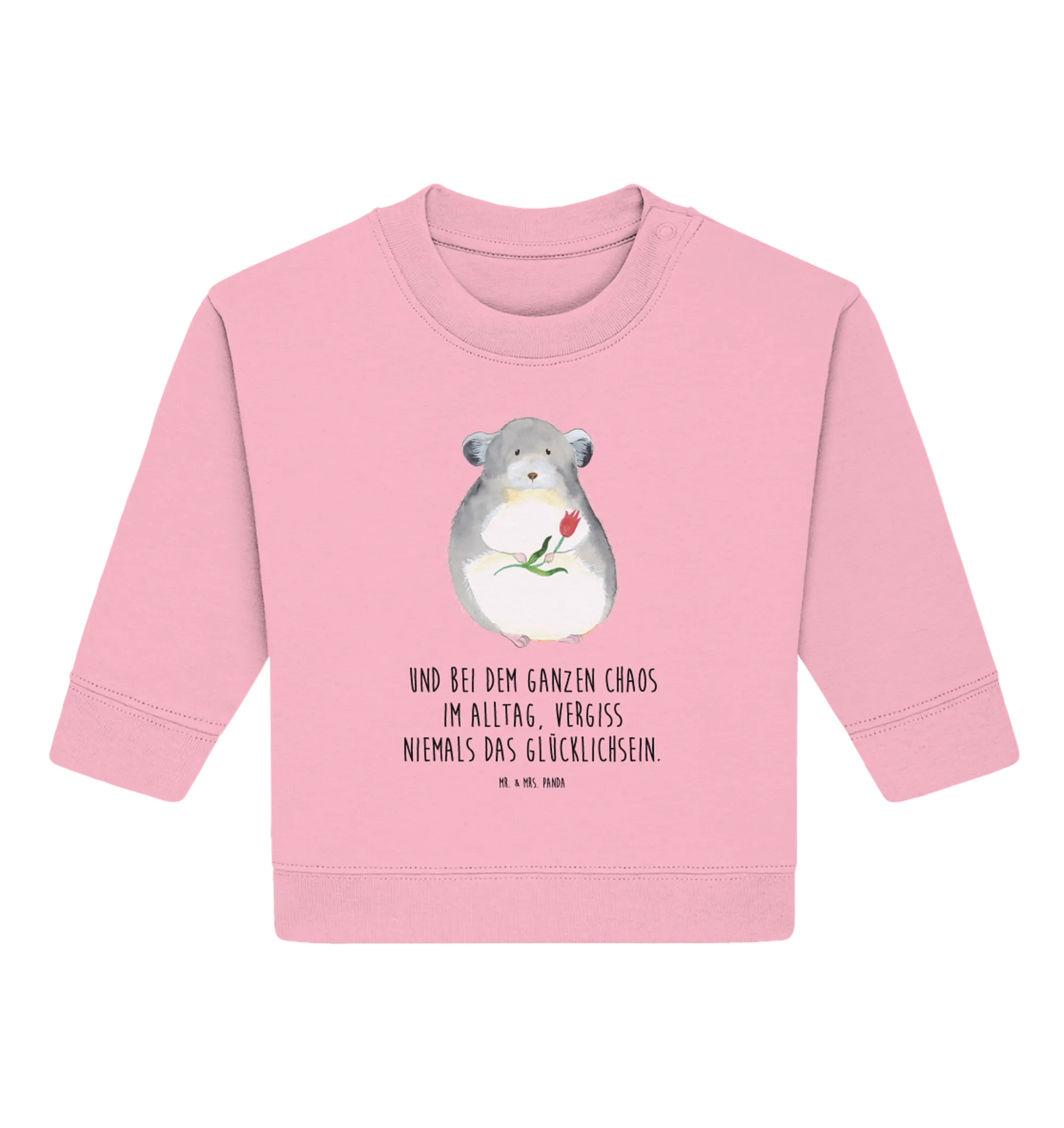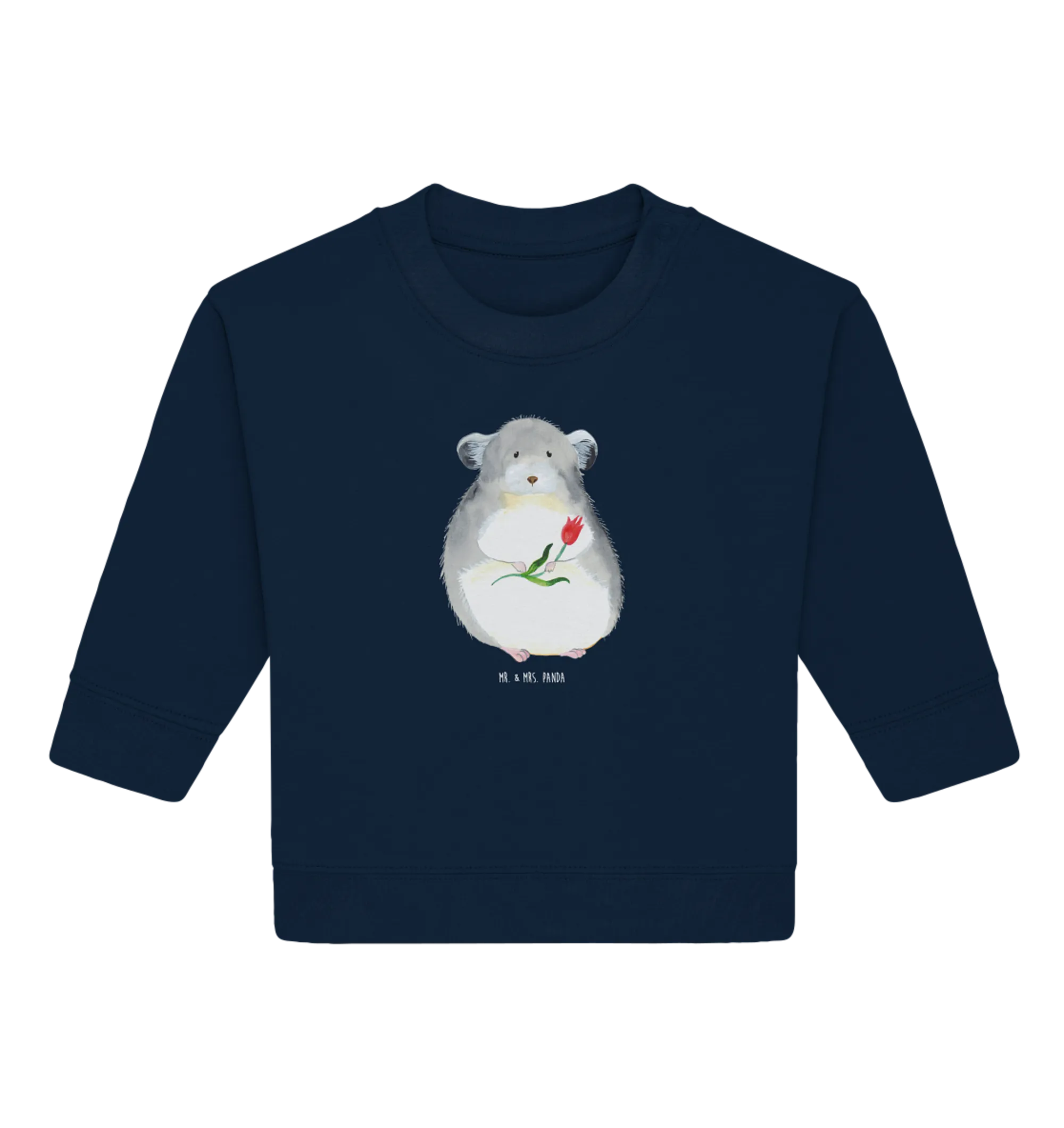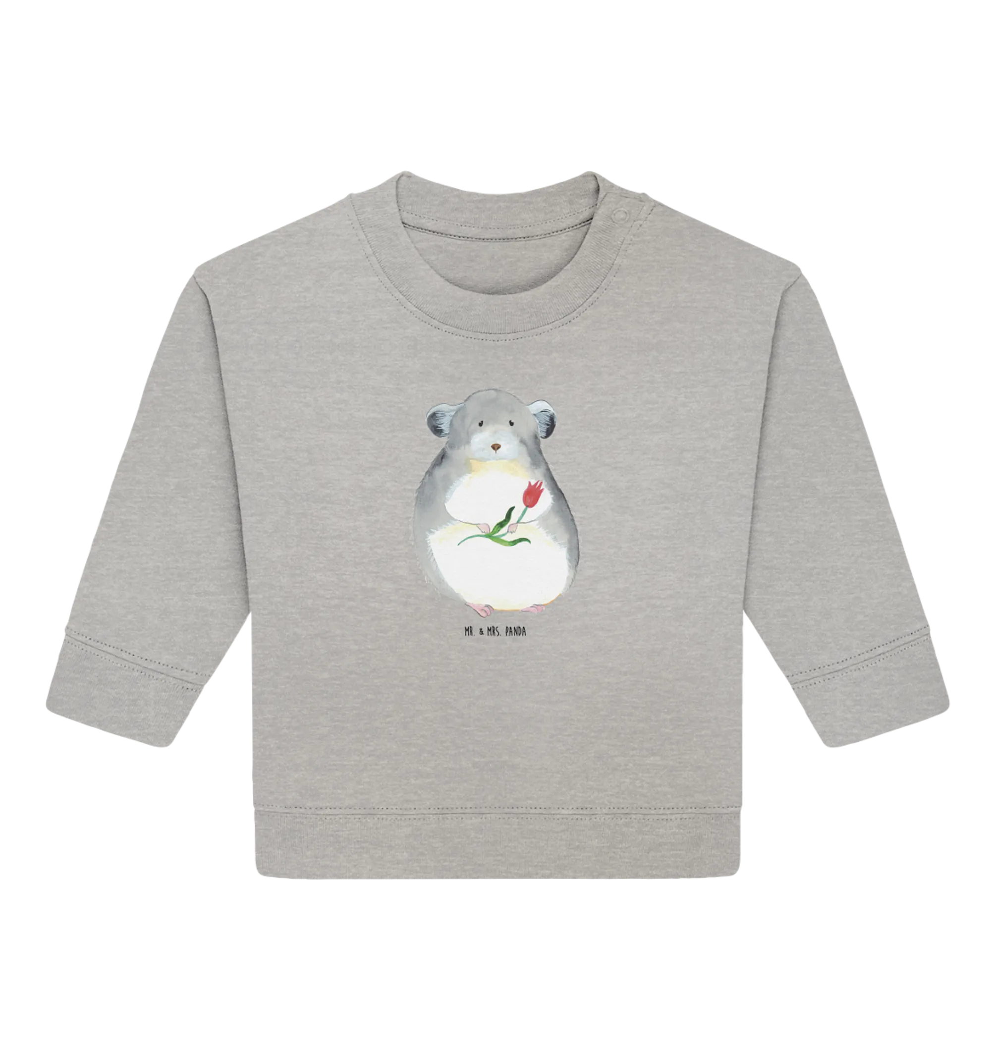 Mit einem entzückenden Chinchilla, das verwundert dasteht und eine Blume in der Hand hält, bringt dieser Pullover Freude und gute Laune in den Alltag. Die zarte Aquarellzeichnung von Mrs. Panda verleiht dem Pullover einen einzigartigen Charme, der jedes Baby-Lächeln noch strahlender macht.