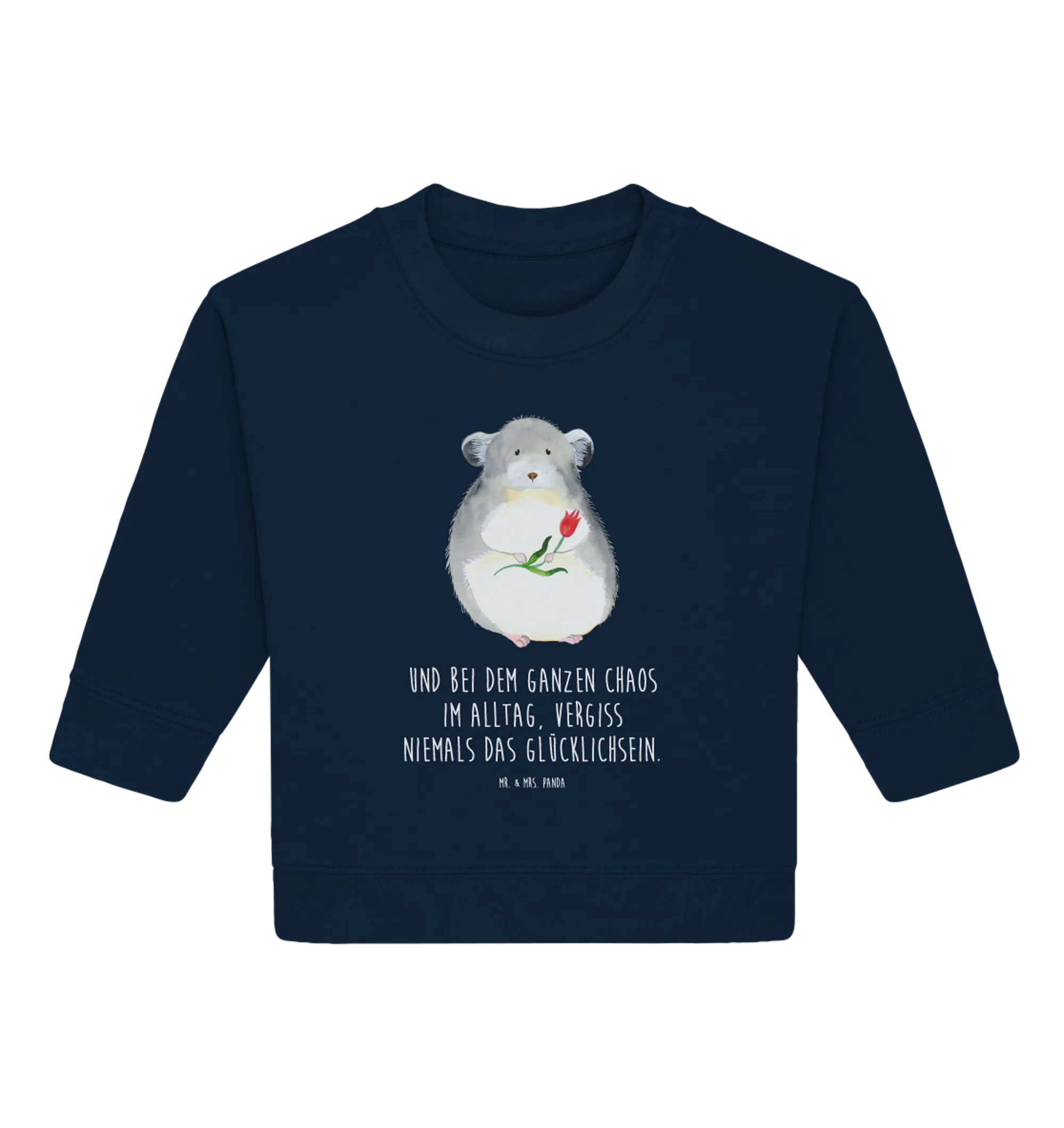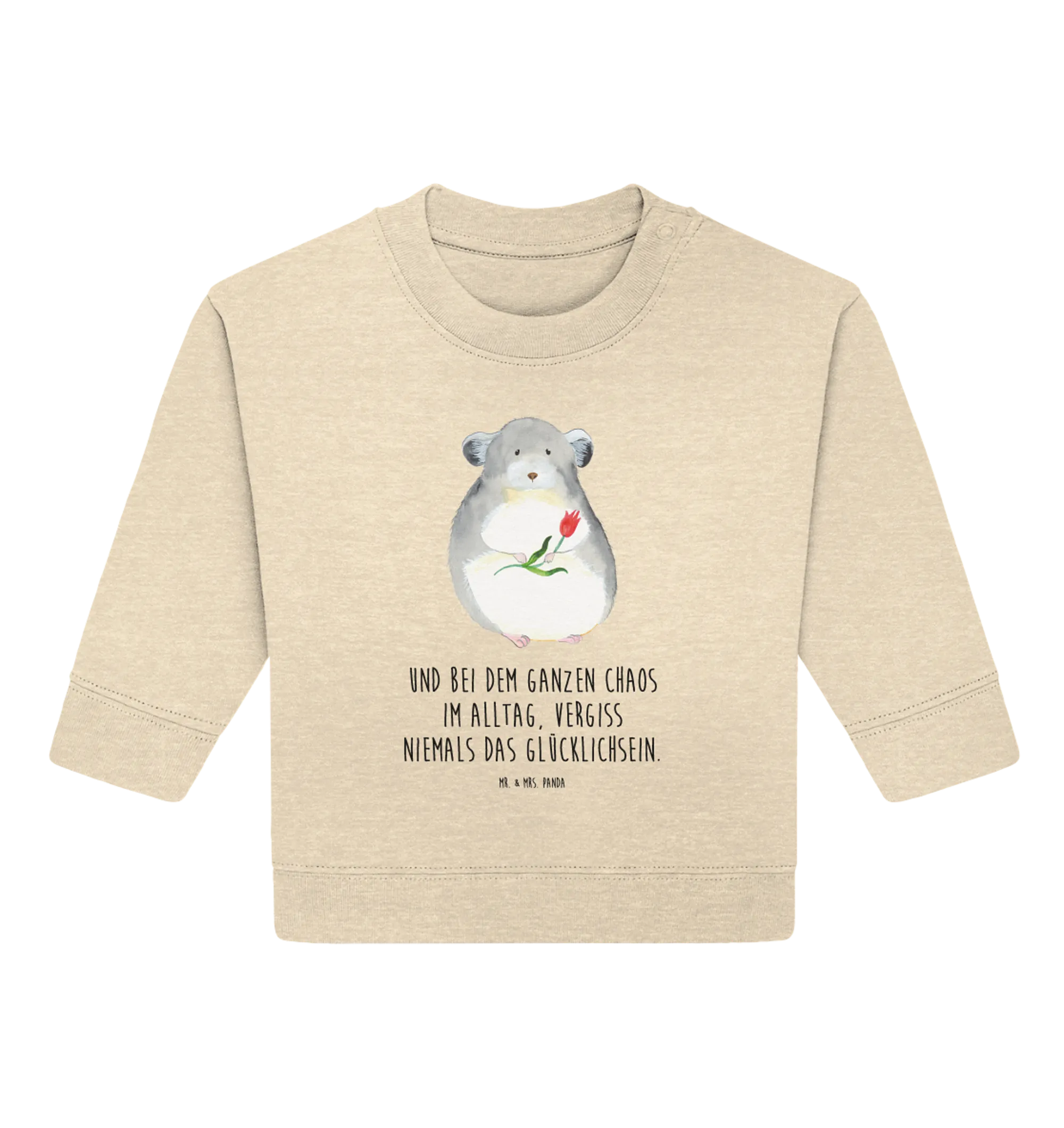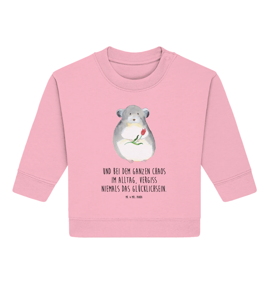 Mit einem entzückenden Chinchilla, das verwundert dasteht und eine Blume in der Hand hält, bringt dieser Pullover Freude und gute Laune in den Alltag. Die zarte Aquarellzeichnung von Mrs. Panda verleiht dem Pullover einen einzigartigen Charme, der jedes Baby-Lächeln noch strahlender macht.