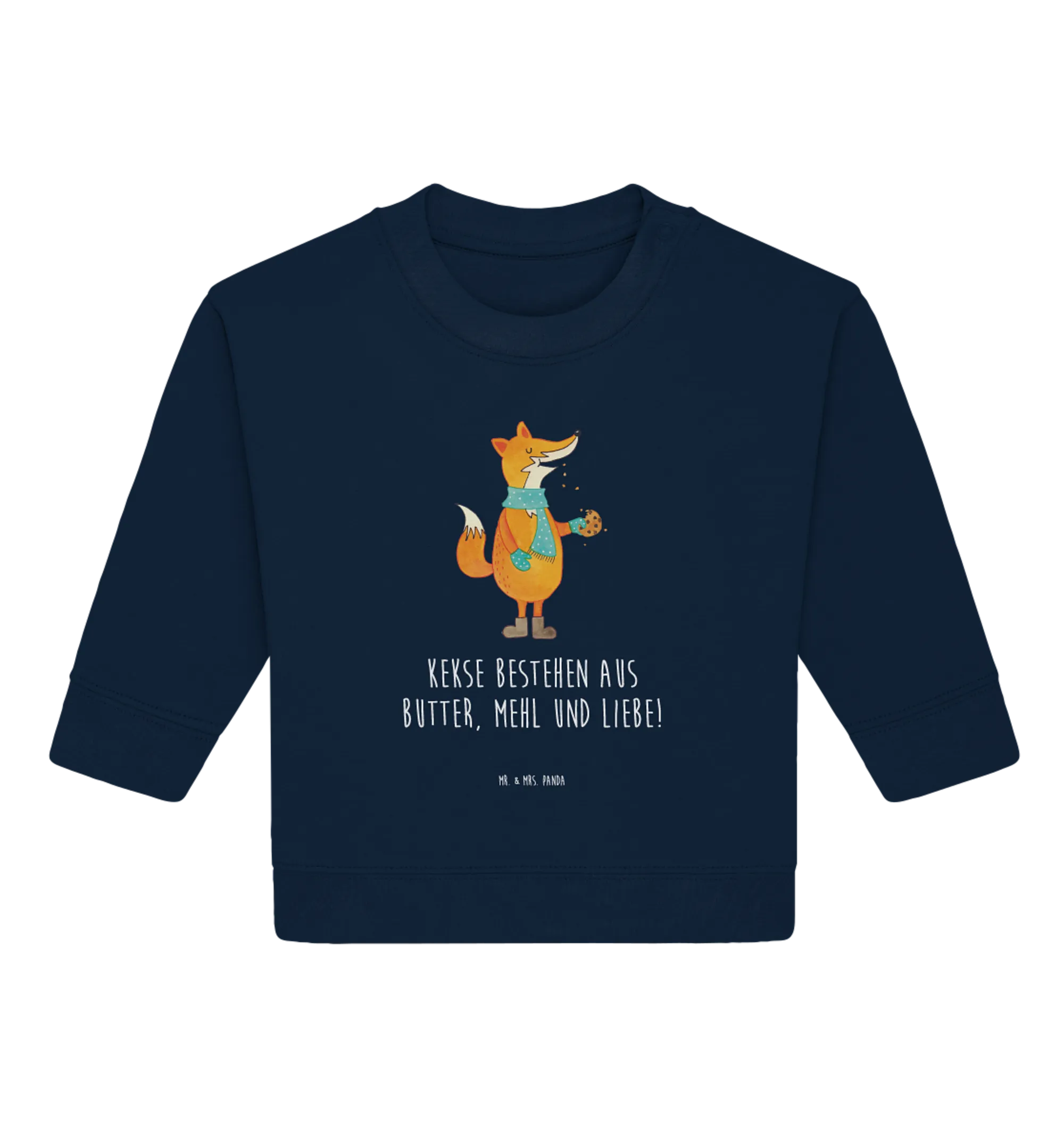 Entdecke unseren zauberhaften Organic Baby Pullover Fuchs Keks aus der beliebten Fuchs Kollektion von Mr. & Mrs. Panda! Dieser niedliche Pullover vereint kuschelige Baumwolle mit einem herzlichen Design, das jedes kleine Herz höher schlagen lässt. Das Motiv eines frechen Fuchses, der mit einem köstlichen Keks spielt, ist nicht nur ein echter Blickfang, sondern erzählt auch von der Liebe, die in der Küche steckt. 'Kekse bestehen aus Butter, Mehl und Liebe!' – ein Spruch, der die Vorfreude auf die Weihnachtszeit und das gemeinsame Backen mit der Familie verkörpert.