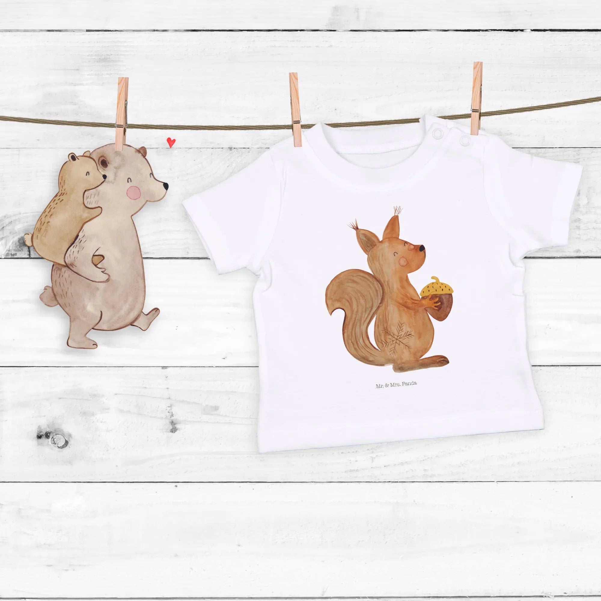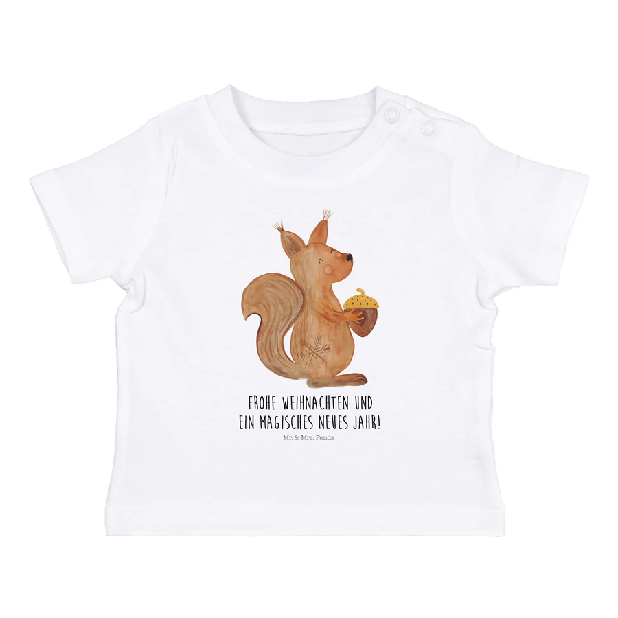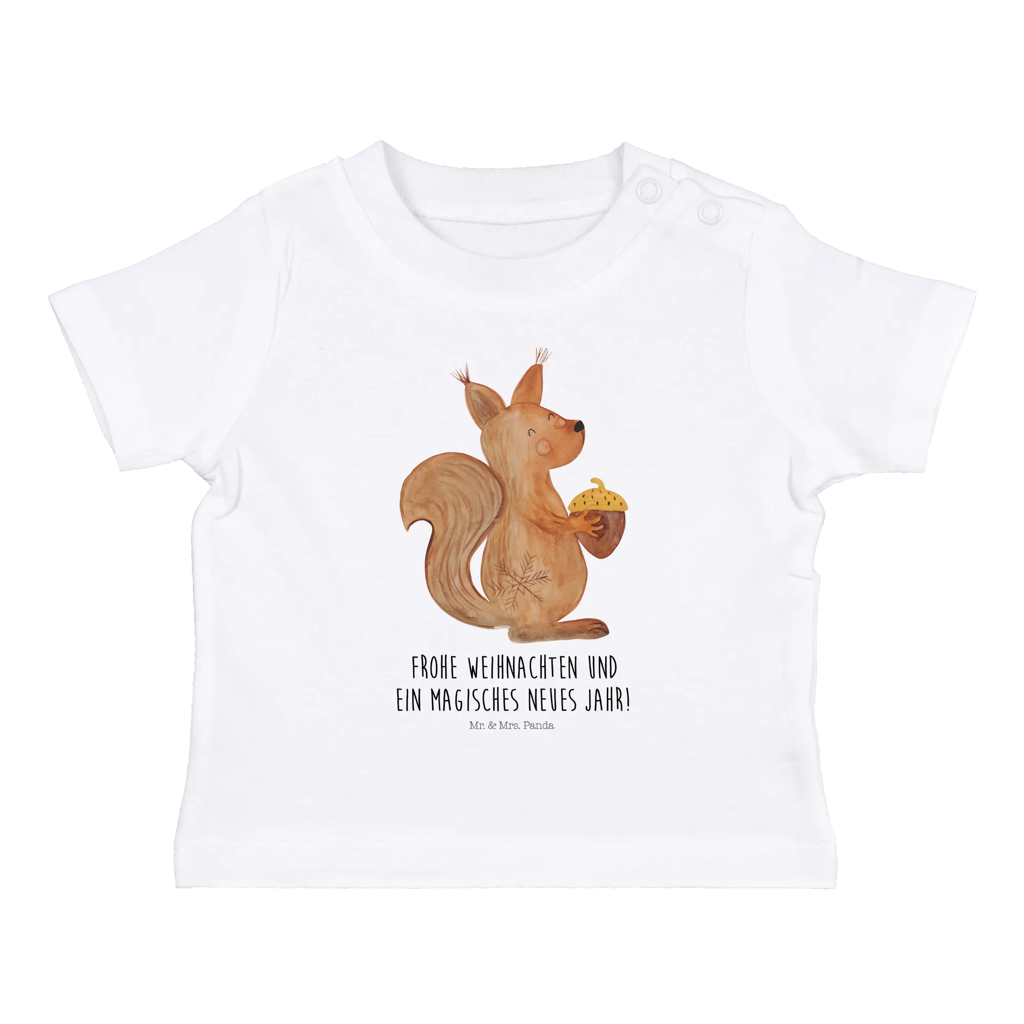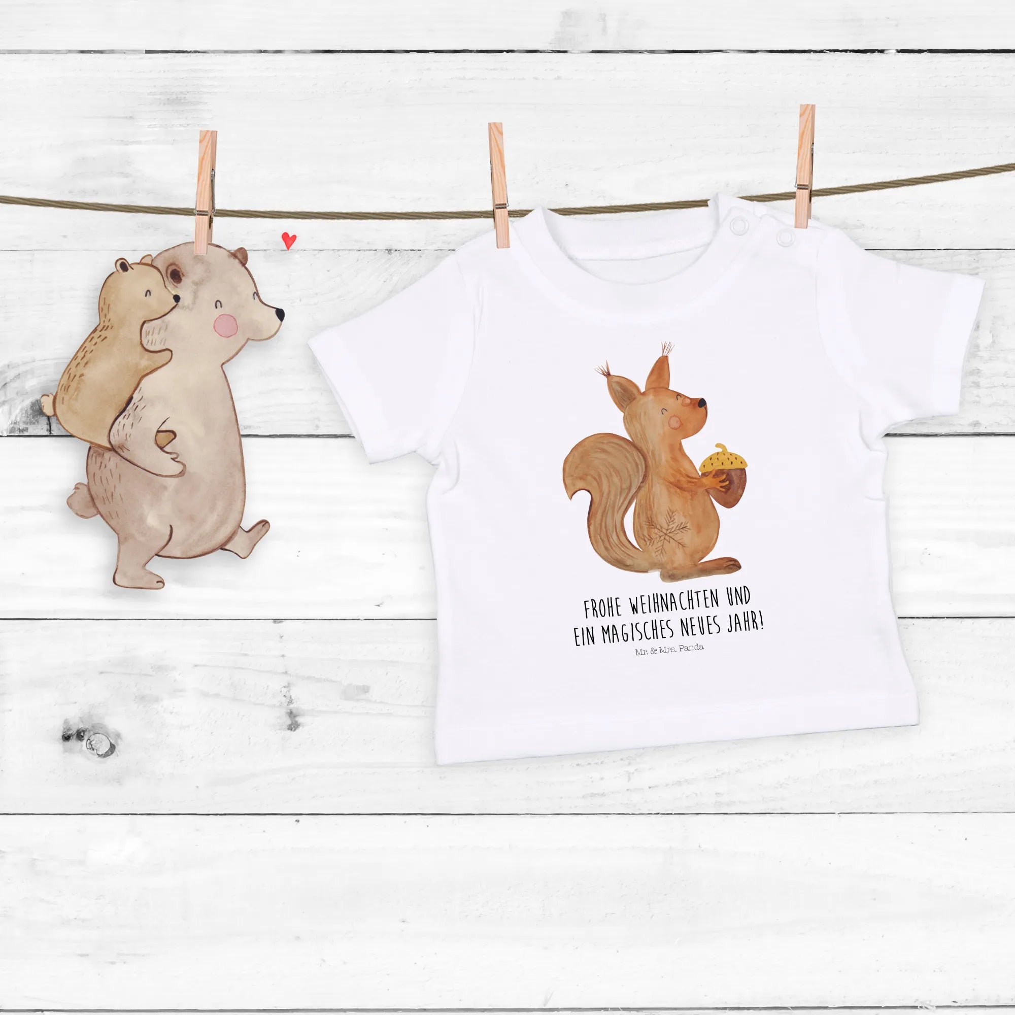 Das fröhliche Eichhörnchen Weihnachtszeit Baby T-Shirt von Mr. & Mrs. Panda bringt die zauberhafte Stimmung der Winter- und Weihnachtszeit in den Kleiderschrank Deiner kleinen Lieblinge. Der süße Print zeigt ein knuffiges Eichhörnchen mit großen, strahlenden Augen, das eine Eichel hält – verziert mit einer kleinen Schneeflocke, während es den ersten Schnee des Jahres beobachtet.