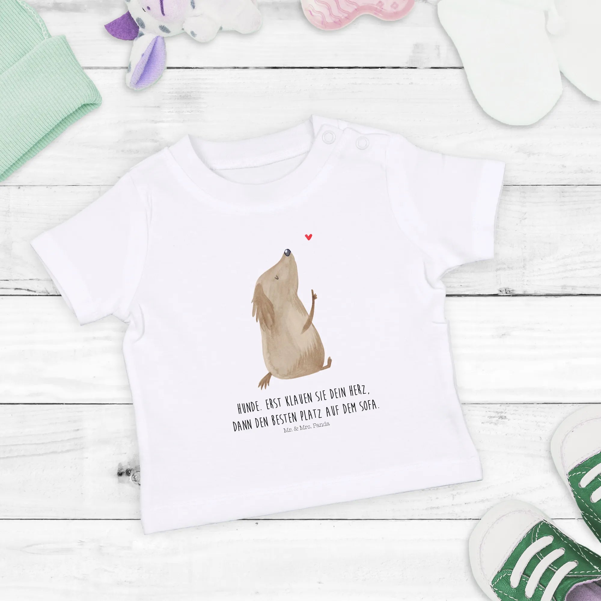 Mach Deinem Baby oder einem kleinen Hundeliebhaber in Deinem Freundeskreis eine Freude! Das Organic Baby Shirt "Hund Liebe" ist nicht nur ein modisches Statement, sondern auch ein kleiner Ausdruck der großen Liebe zu unseren Vierbeinen. Lass die Liebe durch die Shirts sprechen und teile sie mit der Welt! Mit Mr. & Mrs. Panda bringst Du einen Hauch von Freude in den Alltag ihrer Kleinen – und machst gleichzeitig die Welt ein wenig bunter!