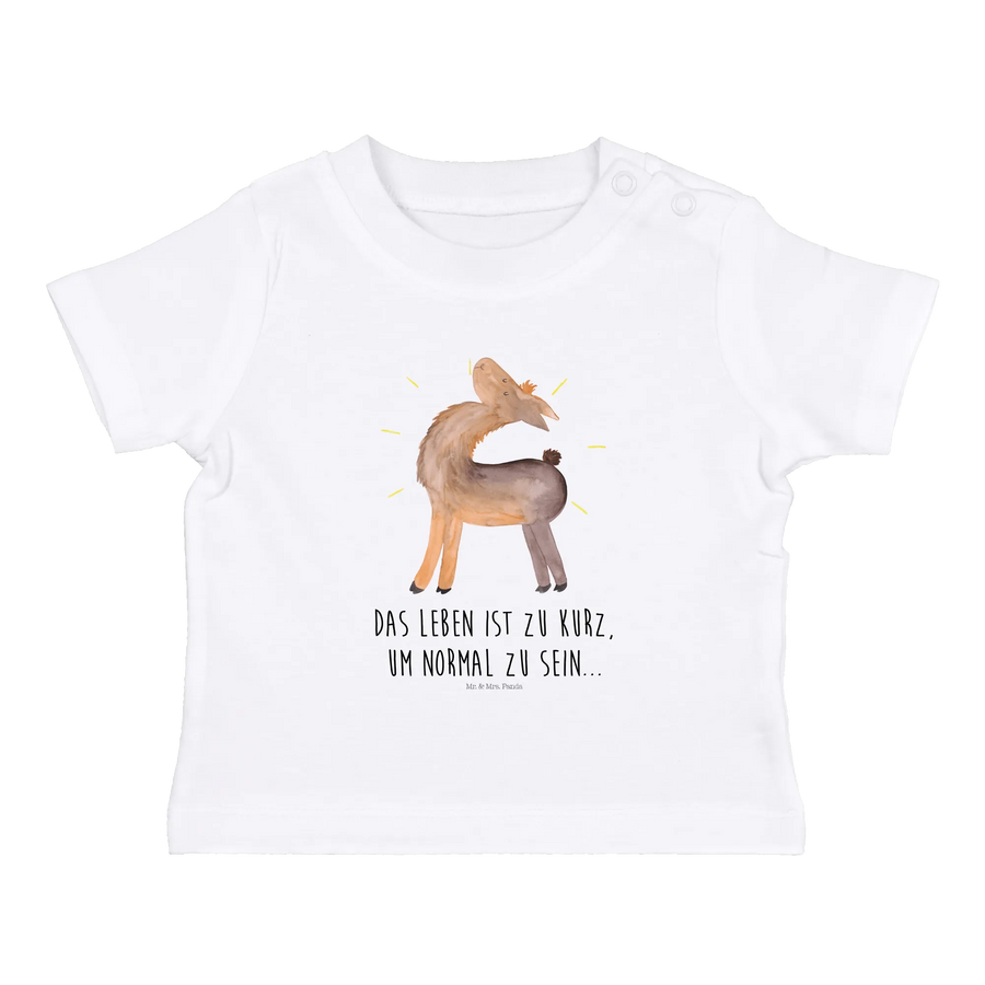 Das Baby Shirt trägt den stolzen Blick eines Lama – ein echter Hingucker bei jedem Anlass, ob beim Spielplatzbesuch oder dem nächsten Familienfest. Das Motto "Das Leben ist zu kurz, um normal zu sein…" passt perfekt zu unserem Lama-Design und hebt die Individualität deiner Kleinen hervor.
