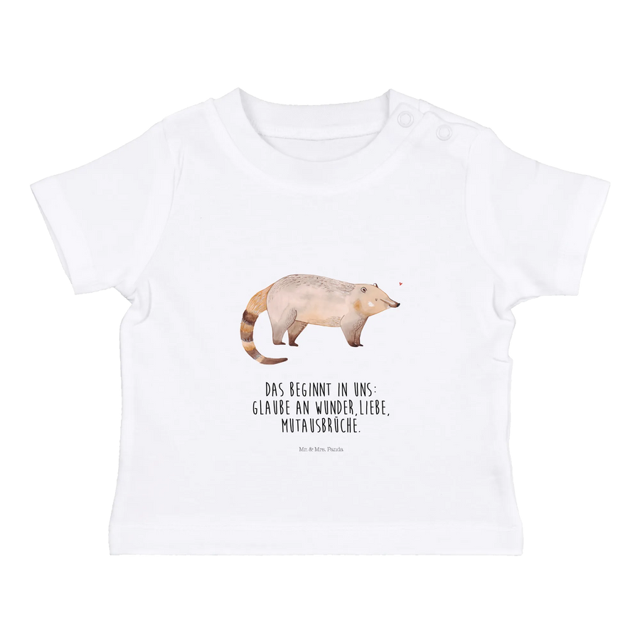 Das süße Nasenbär Baby T-Shirt aus der Small World Kollektion von Mr. & Mrs. Panda ist das perfekte Geschenk für kleine Abenteurer und ihre Eltern. Hergestellt aus hochwertiger, ökologischer Baumwolle, bietet dieses Shirt nicht nur ein angenehmes Tragegefühl, sondern auch die Sicherheit, dass es sanft zur empfindlichen Babyhaut ist. Das niedliche Nasenbär-Motiv wird von einem kleinen, roten Herzchen begleitet, was dem Shirt eine liebevolle Note verleiht. Egal ob für das eigene Baby oder als zauberhaftes Geschenk zur Geburt, Taufe, oder dem ersten Geburtstag, dieses T-Shirt ist ein echter Hingucker!