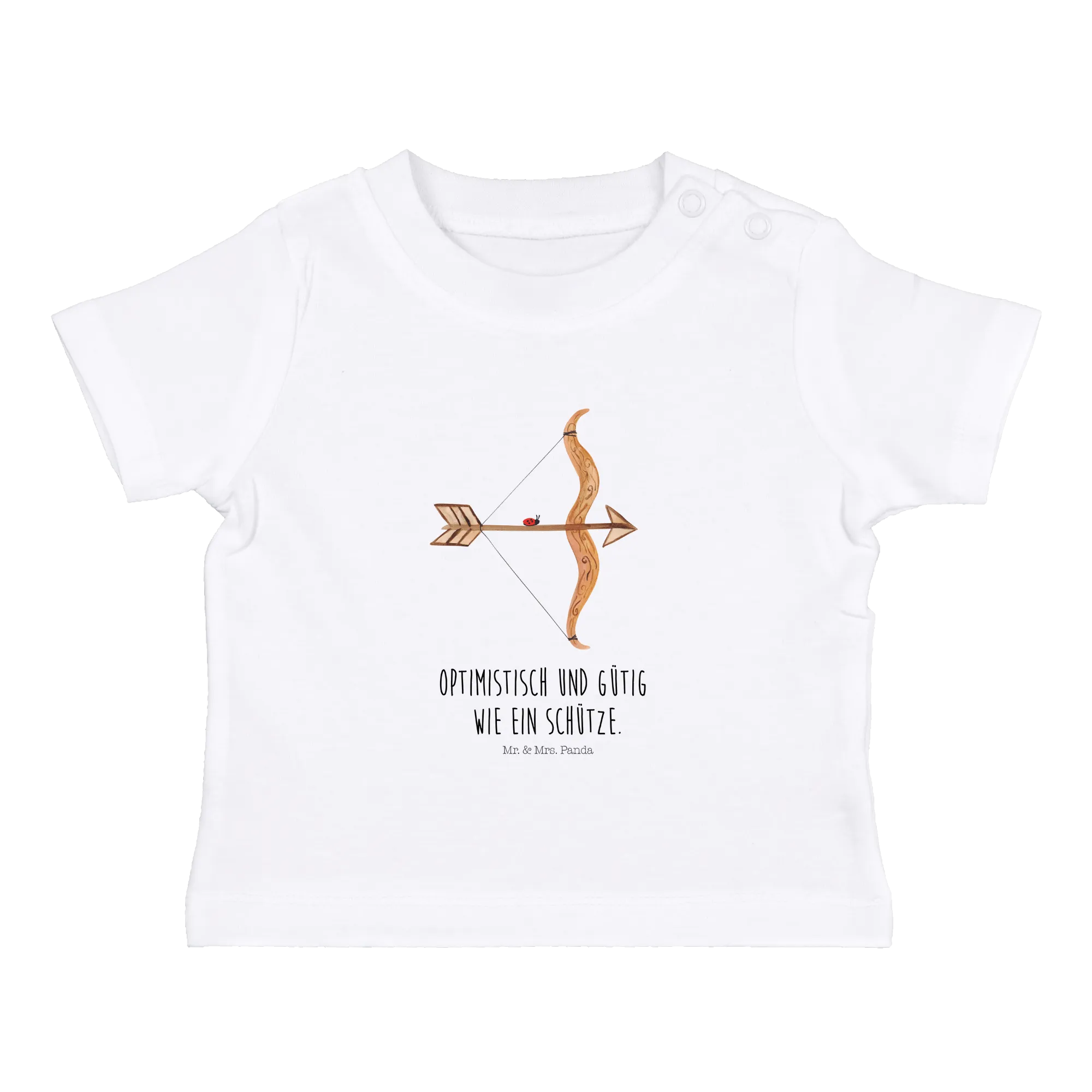 Die liebevoll handgezeichneten Motive von Mr. & Mrs. Panda geben den kleinen Erdenbürgern einen Hauch von Astronomie mit einem Lächeln auf den Lippen mit. Das Design zeigt den Schützen mit Pfeil und Bogen, begleitet von dem schönen Slogan: "Optimistisch und gütig wie ein Schütze." Damit wird jedes Baby zum kleinen Glücksbringer, der Freude und Optimismus ins Leben bringt.