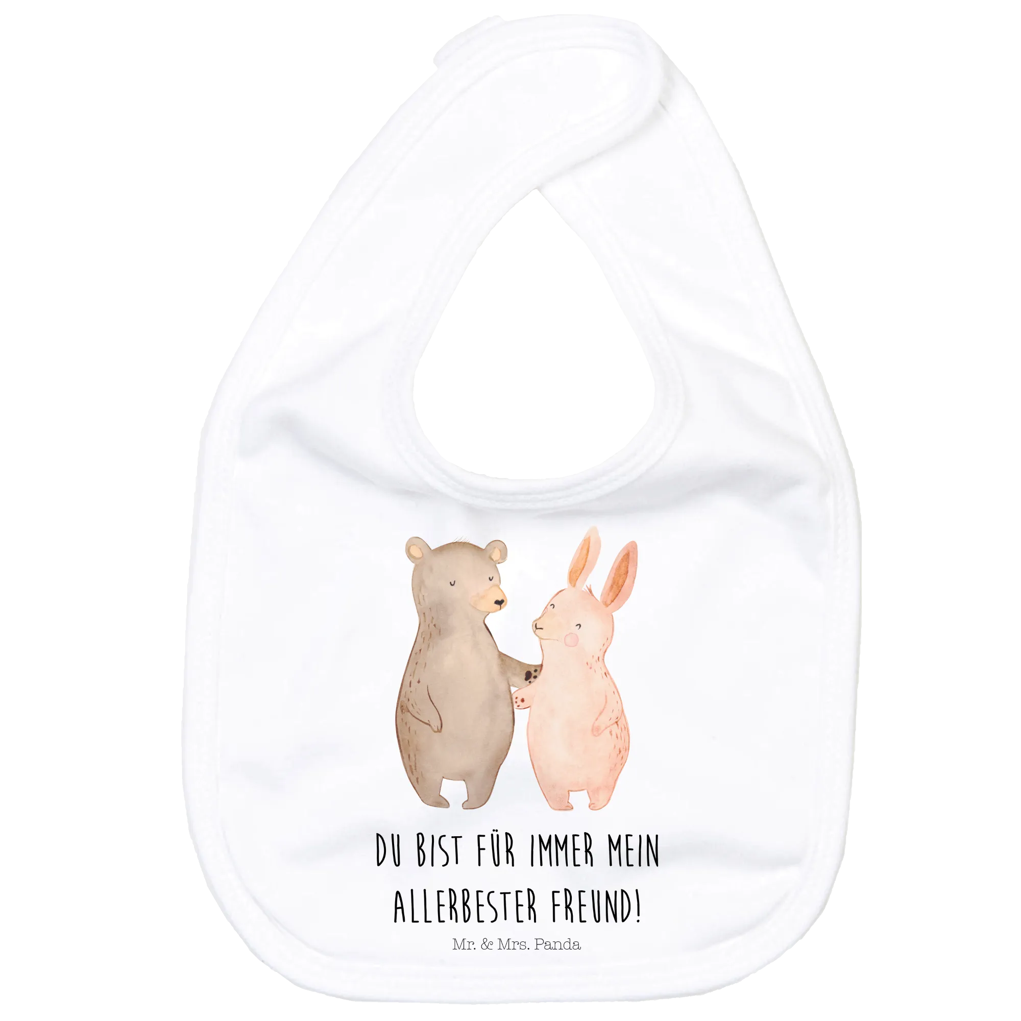 Das Motiv von Bär und Hase, die sich umarmen, symbolisiert die innige Freundschaft und die schöne Verbundenheit, die zwischen Kindern und ihren besten Freunden wächst. Stell dir vor, wie das kleine Baby bei seinen ersten Essversuchen voller Freude in diesem Lätzchen sitzt und die Welt um sich herum entdeckt, während es gleichzeitig vor allen Flecken und Spritzern geschützt ist.