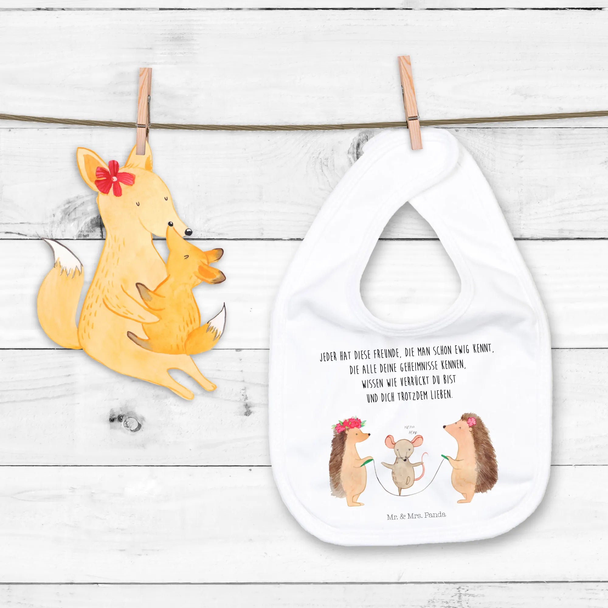 Mit viel Liebe zum Detail zeigt das Lätzchen zwei süße Igel, die fröhlich am Seil hüpfen, begleitet von einer bezaubernden Maus. Ein herrliches Motiv, das nicht nur die Kleinsten begeistert, sondern auch für gute Laune sorgt.