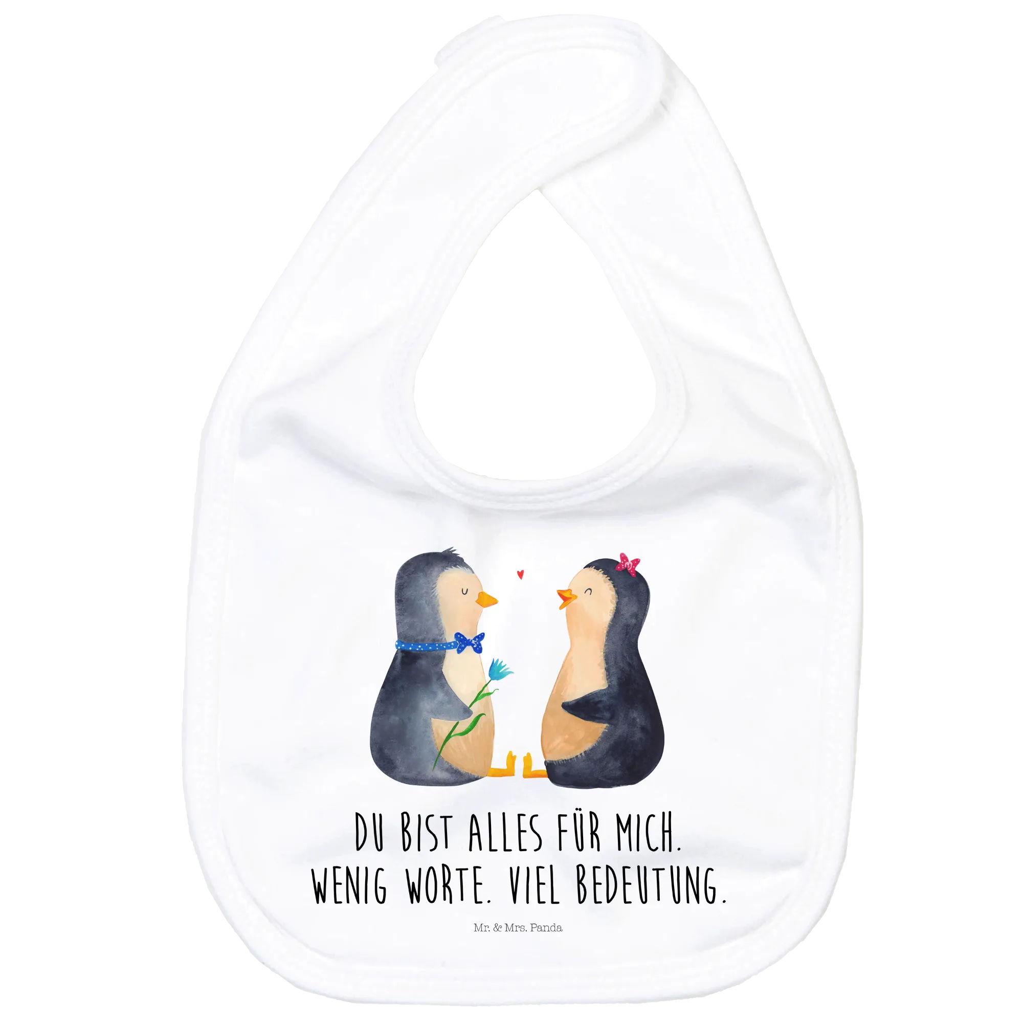 Mit dem Lebensmotto „Du bist alles für mich. Wenig Worte. Viel Bedeutung.“ vermittelt das Motiv pure Liebe. Die beiden Pinguine haben nicht nur einen niedlichen Look, sie strahlen auch eine herzliche Verbundenheit aus, die perfekt zu einem Geschenk für frisch gewonnene Eltern oder zur Feier einer Verlobung passt. Als Geschenk zur Geburt oder als Babygeschenk ist dieses Lätzchen eine ausgezeichnete Wahl!