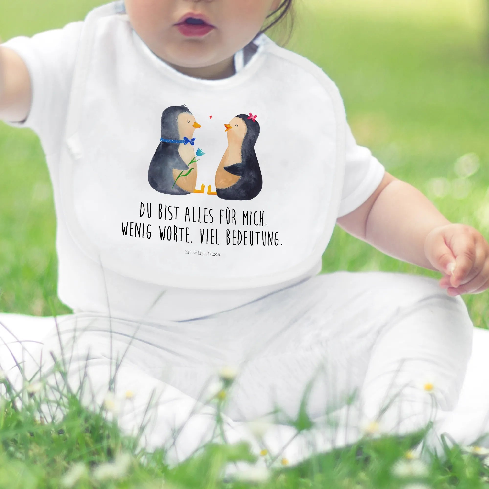 Die beiden Pinguine, die sich voller Liebe gegenüberstehen, symbolisieren nicht nur Zuneigung, sondern auch die unvergängliche Liebe der Familie. Mit dem Slogan 'Du bist alles für mich. Wenig Worte. Viel Bedeutung.' wird dieses Babylätzchen zu einem besonderen Liebesbeweis für dein Baby.