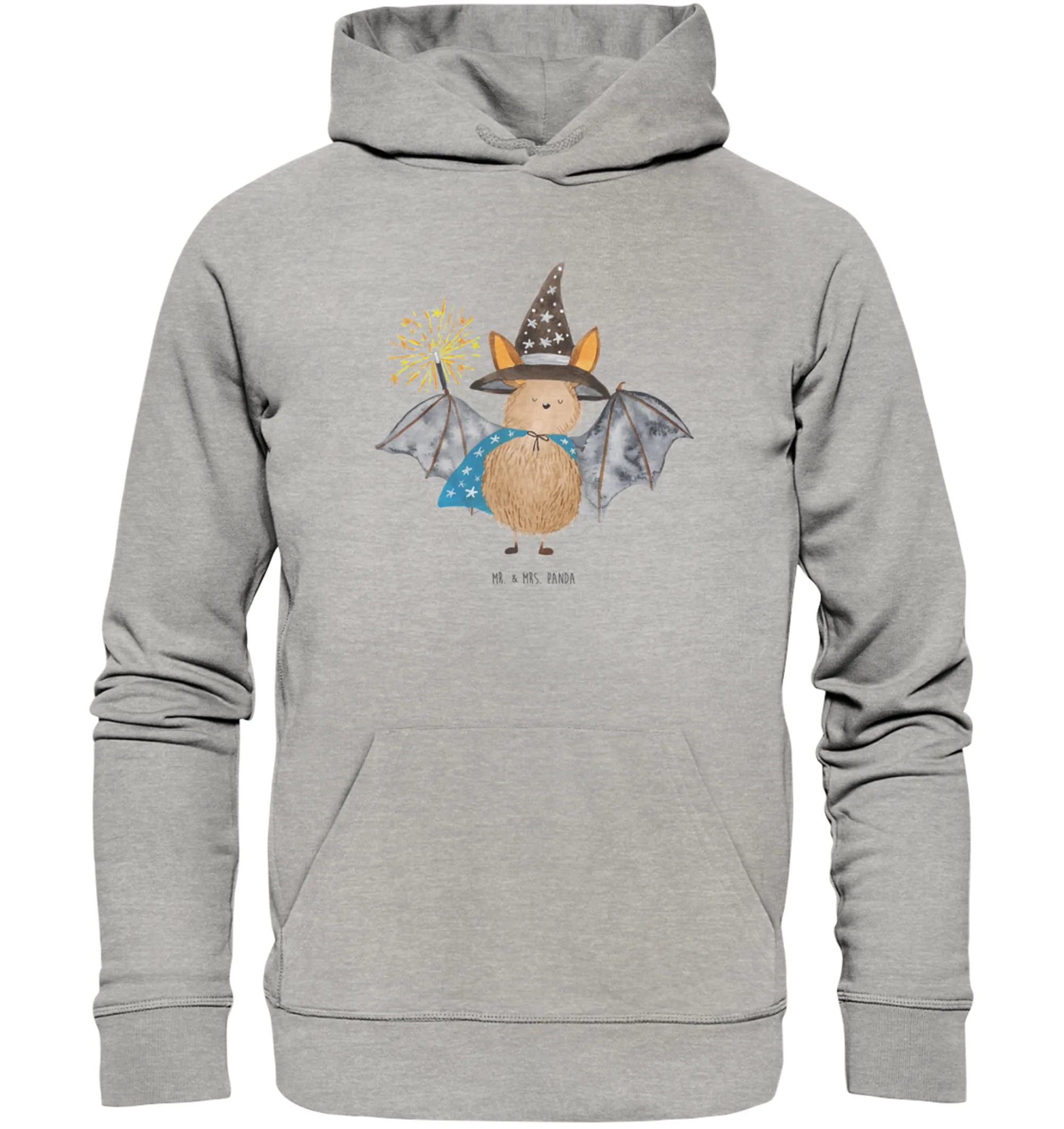 Wenn du auf der Suche nach einem ganz besonderen Geschenk bist, dann ist der Organic Hoodie mit dem einzigartigen Motiv 'Fledermaus Zauberer' aus der Small World Kollektion genau das Richtige für dich!