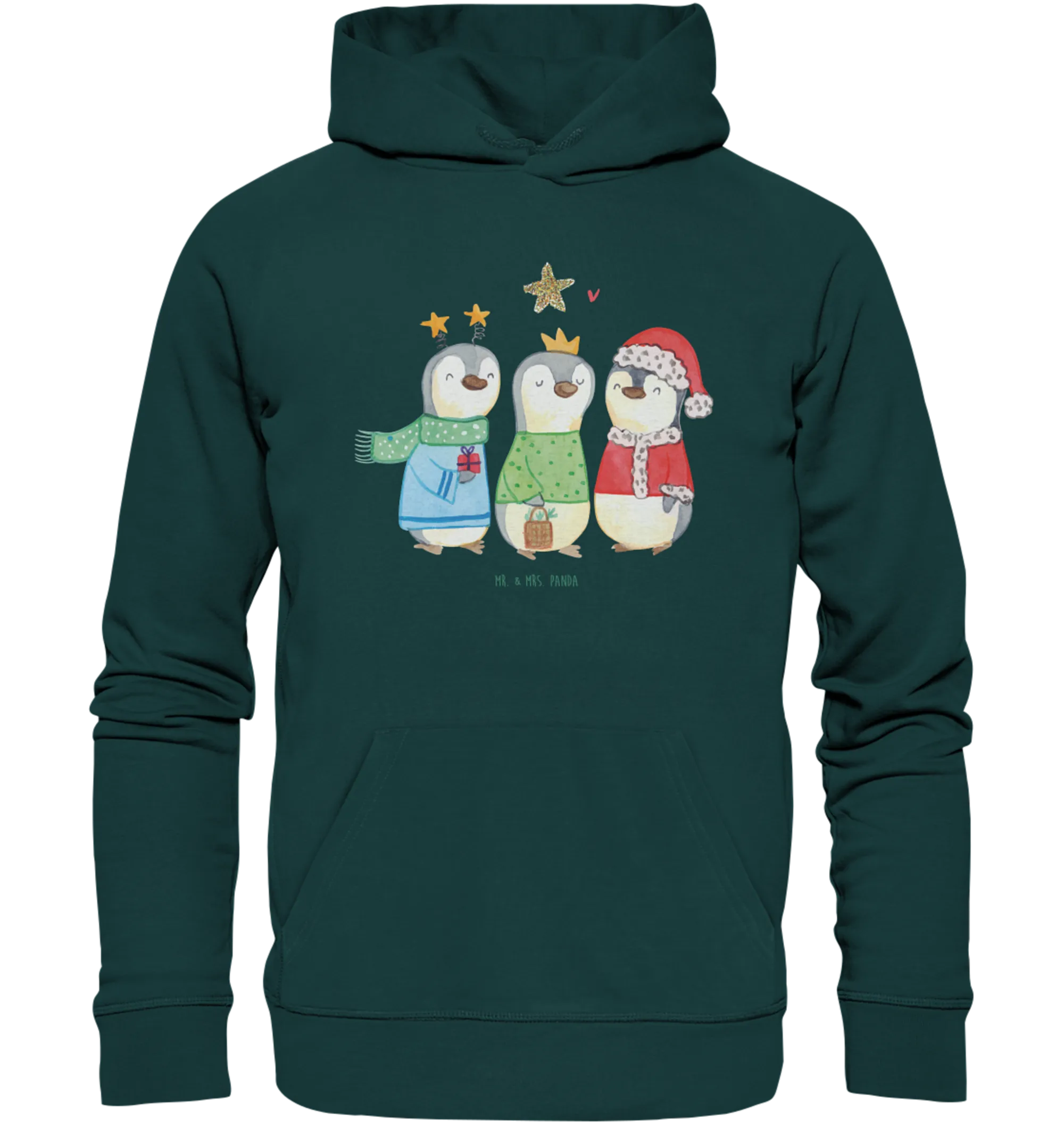 Der Organic Hoodie "Winterzeit Heilige drei Könige" aus der Winter Kollektion von Mr. & Mrs. Panda ist das perfekte Geschenk für die Familie und Freunde zur Weihnachtszeit. Mit seinem niedlichen Motiv, das drei süße Pinguine als heilige drei Könige zeigt, bringt er gleich eine fröhliche und festliche Stimmung in jeden Kleiderschrank. Dieser Kapuzenpullover besteht aus hochwertiger Bio-Baumwolle und bietet dank der gebürsteten, weichen Fleece-Innenseite einen unglaublich gemütlichen Tragekomfort. Erhältlich in Universalgrößen, eignet er sich sowohl für Männer als auch für Frauen und passt wunderbar zu jedem Weihnachtsfest.