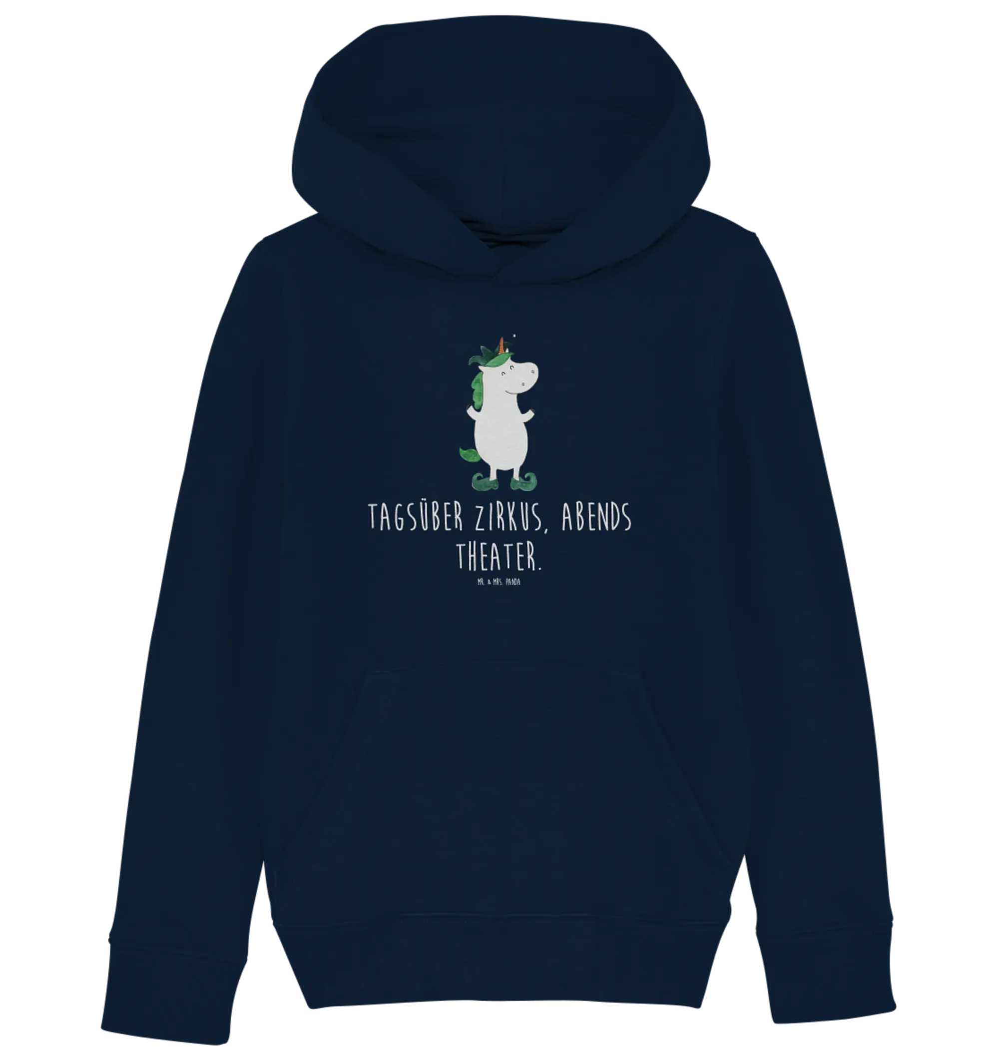 Die Kombination aus hochwertigen Materialien und einem entzückenden Design macht diesen Hoodie zum perfekten Begleiter für den Alltag. Egal, ob beim Spielen im Freien, beim Besuch von Freunden oder beim Entspannen zu Hause, dein kleiner Liebling wird sich in diesem Hoodie immer wohlfühlen. Das Motiv zeigt ein niedliches Einhorn als Hofnarr, das den Spruch "Tagsüber Zirkus, abends Theater." trägt.