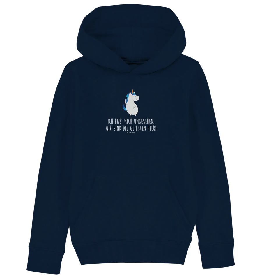 Entdecke den ultimativen Organic Kinder Hoodie mit dem zauberhaften Einhorn Mann aus der Einhorn-Kollektion von Mr. & Mrs. Panda! Dieser Hoodie ist nicht nur unglaublich stylisch, sondern auch ein echtes Must-Have für alle kleinen Einhorn-Fans. Das süße Motiv zeigt ein selbstbewusstes Einhorn, das stolz auf sein Horn zeigt und den Spruch "Ich hab' mich umgesehen. Wir sind die Geilsten hier!". Er ist perfekt für Mädchen und Jungen, die auf der Suche nach einem coolen und bequemen Oberteil für die Schule, Freizeit oder eine aufregende Party sind.
